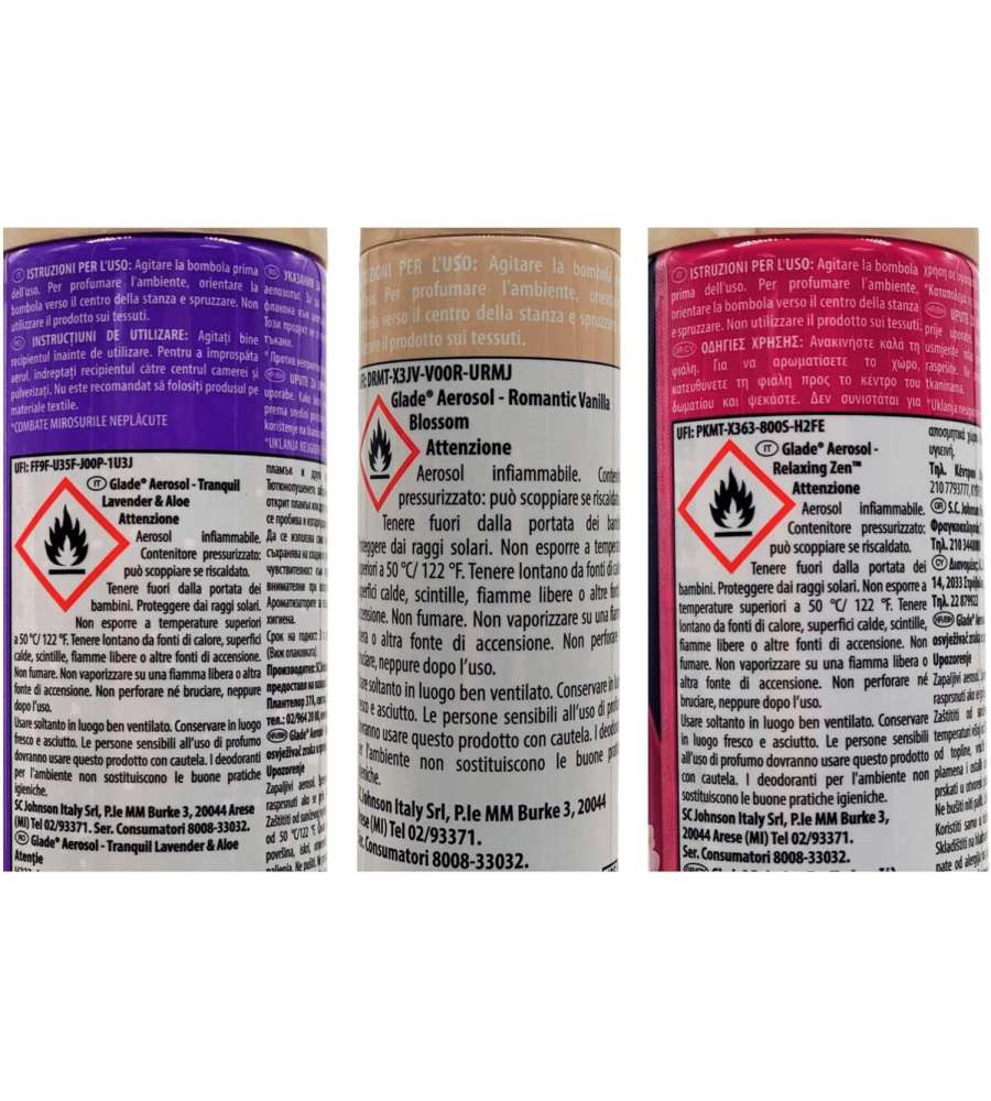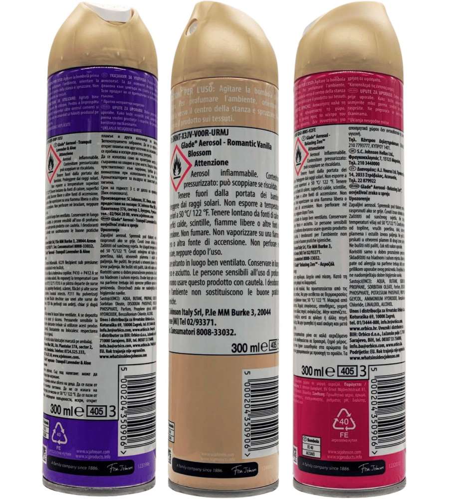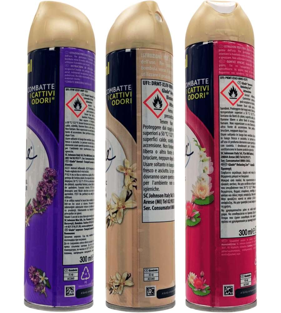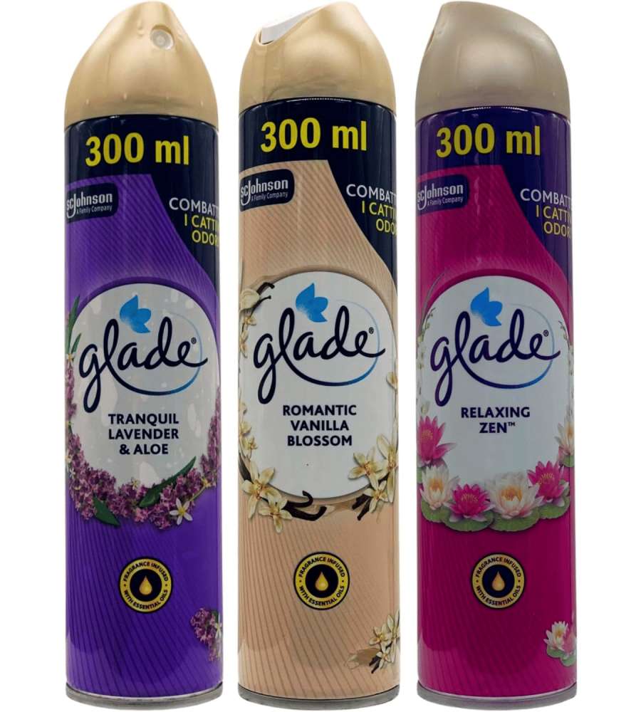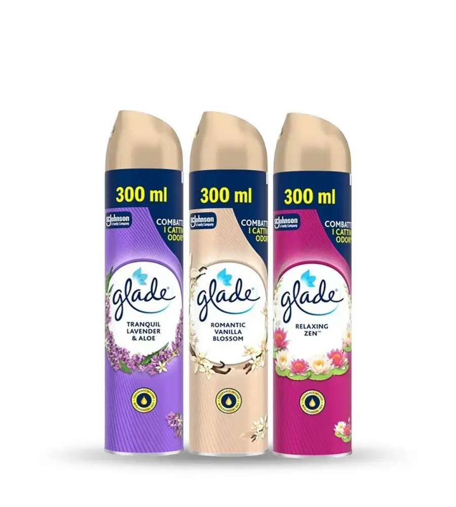 Descrizione: Glade Deodorante Spray Mix 1, una fragranza assortita tra lavanda, zen rilassante e vaniglia per rinfrescare l’aria. Perfetto per eliminare odori sgradevoli, è ideale per casa e ufficio. Fragranza avvolgente e oli essenziali.
