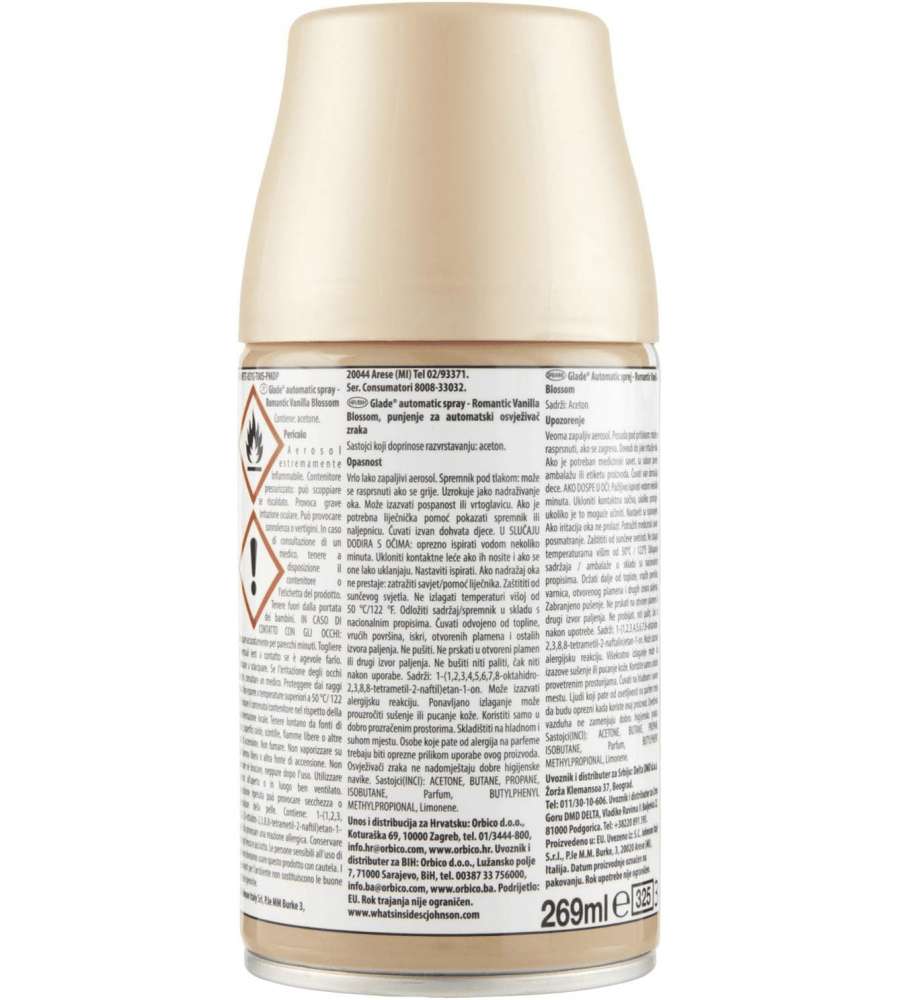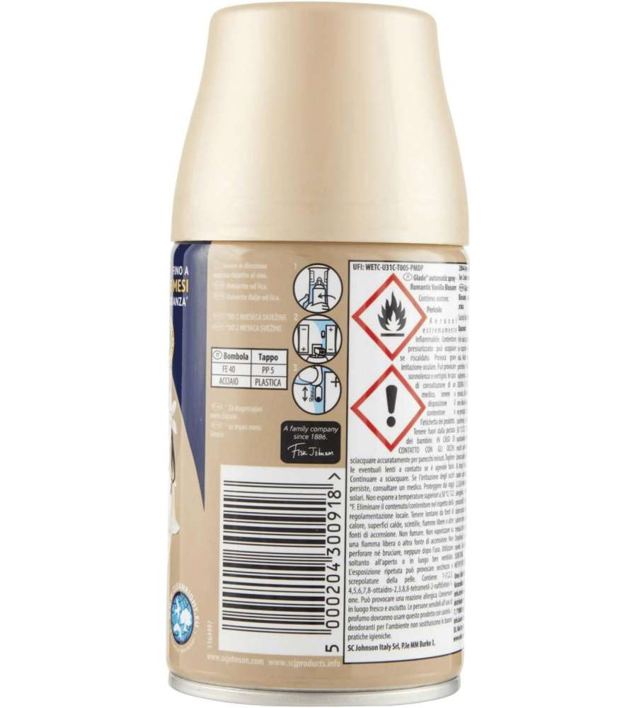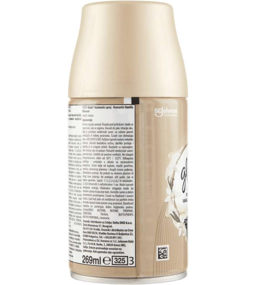 Descrizione: Ricarica per Glade Automatic Spray, fragranza Romantic Vanilla Blossom. Confezione da 269 ml con note di vaniglia e legno bianco. Erogazione personalizzabile ogni 9, 18 o 36 minuti. Perfetta per ogni ambiente!