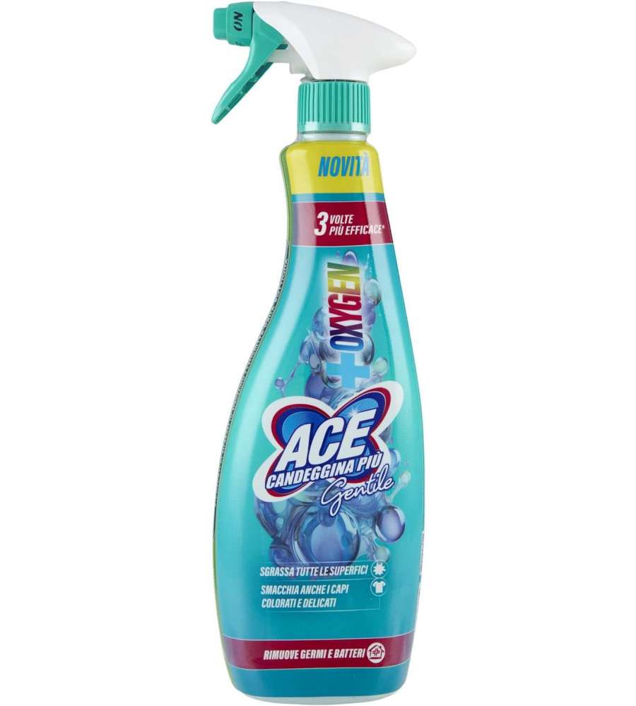 Candeggina spray Ace Gentile Oxygen da 650ml, pratica e facile da usare. Formato spray per una pulizia efficace. Identificata con codice EAN 8001480723672. Ideale per la casa, offre risultati delicati e potenti contro le macchie.Indicato per: