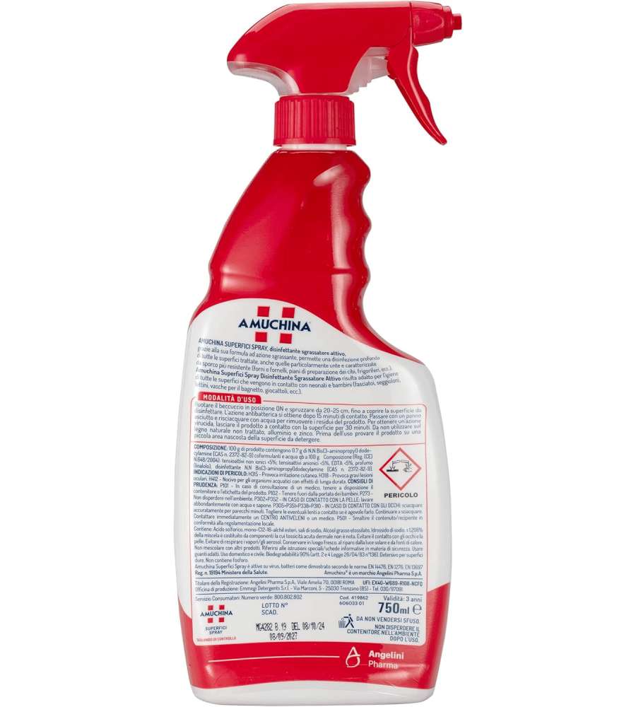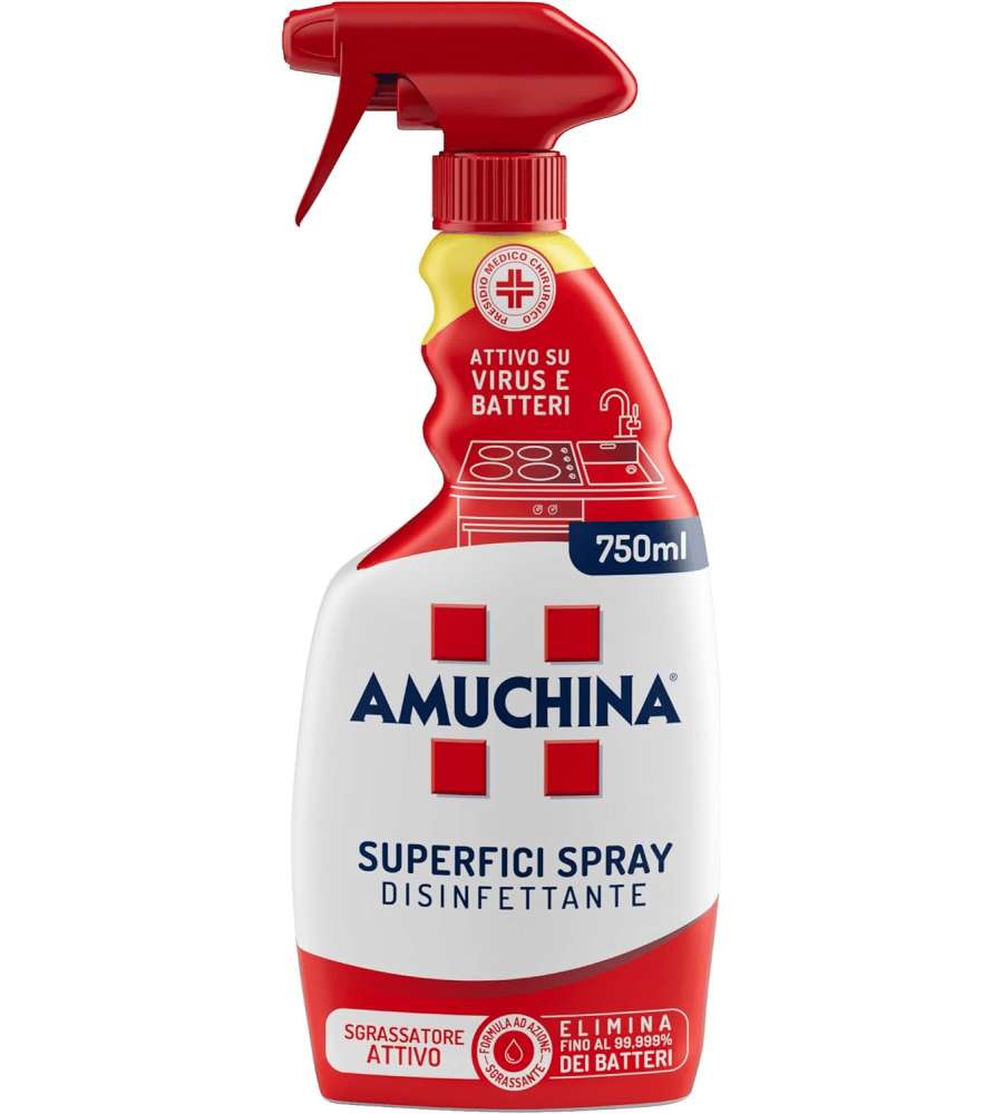 Disinfettante spray Amuchina da 750 ml, efficace contro virus e batteri. Formula sgrassante, ideale per superfici di cucine e giocattoli. Odore fresco, facile applicazione. Sicuro per superfici a contatto con bambini. Uso esterno.Uso esterno: