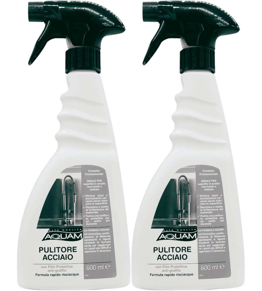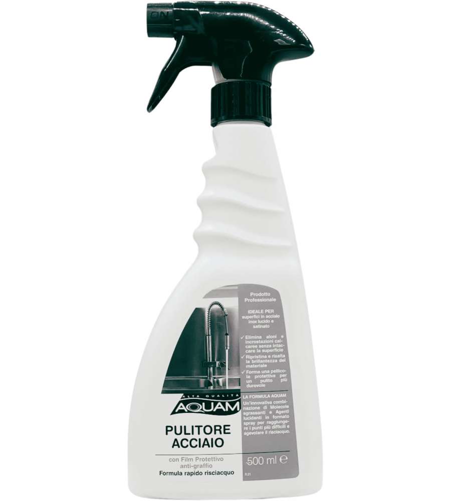Descrizione: Pulitore acciaio spray Aquam da 500ml, ideale per superfici inox lucido e satinato. Formula anti-graffio con risciacquo rapido, rimuove aloni e macchie, garantendo brillantezza duratura.