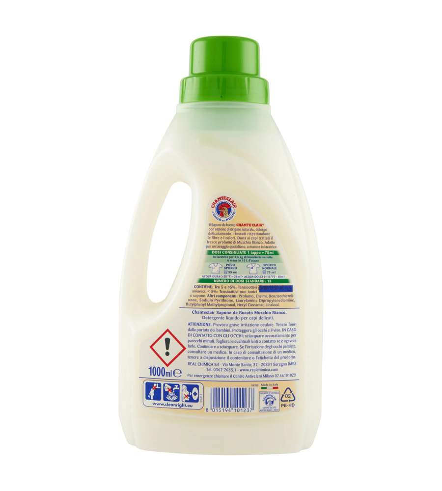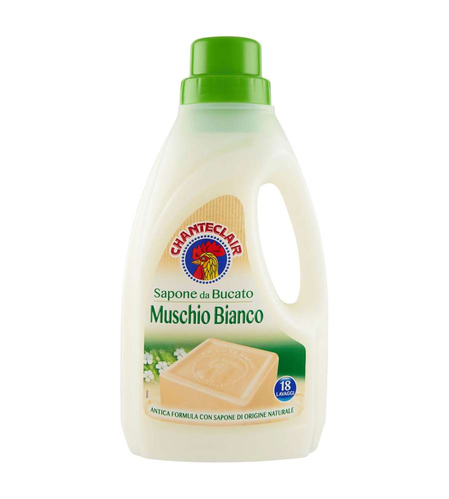 Descrizione: Sapone liquido da bucato Muschio Bianco 1L Chanteclair. Deterge delicatamente senza danneggiare i tessuti, lasciando un fresco profumo. Ideale per lavaggio a mano e in lavatrice.