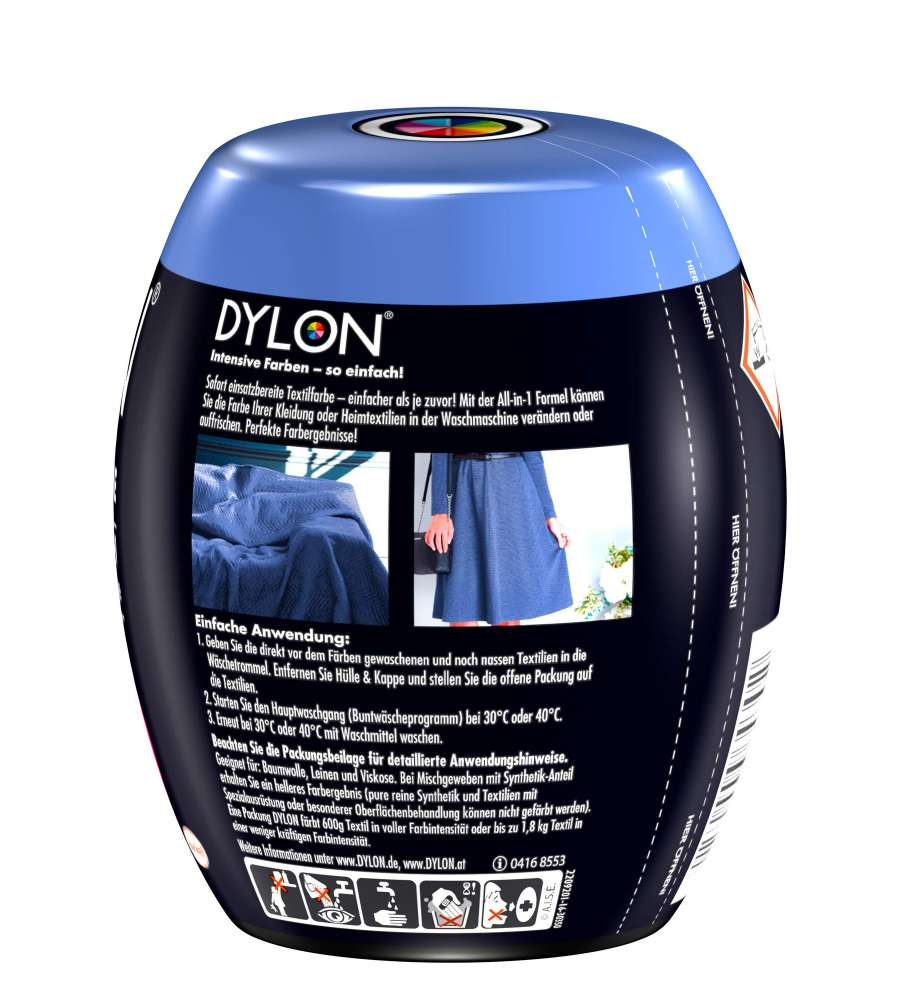 Descrizione: Rinnova i tuoi tessuti con il colorante Dylon N.26 Ocean Blue. Facile da usare in lavatrice, ideale per cotone, lino e viscosa. Colora fino a 1,8 kg di tessuto con tonalità vibrante.