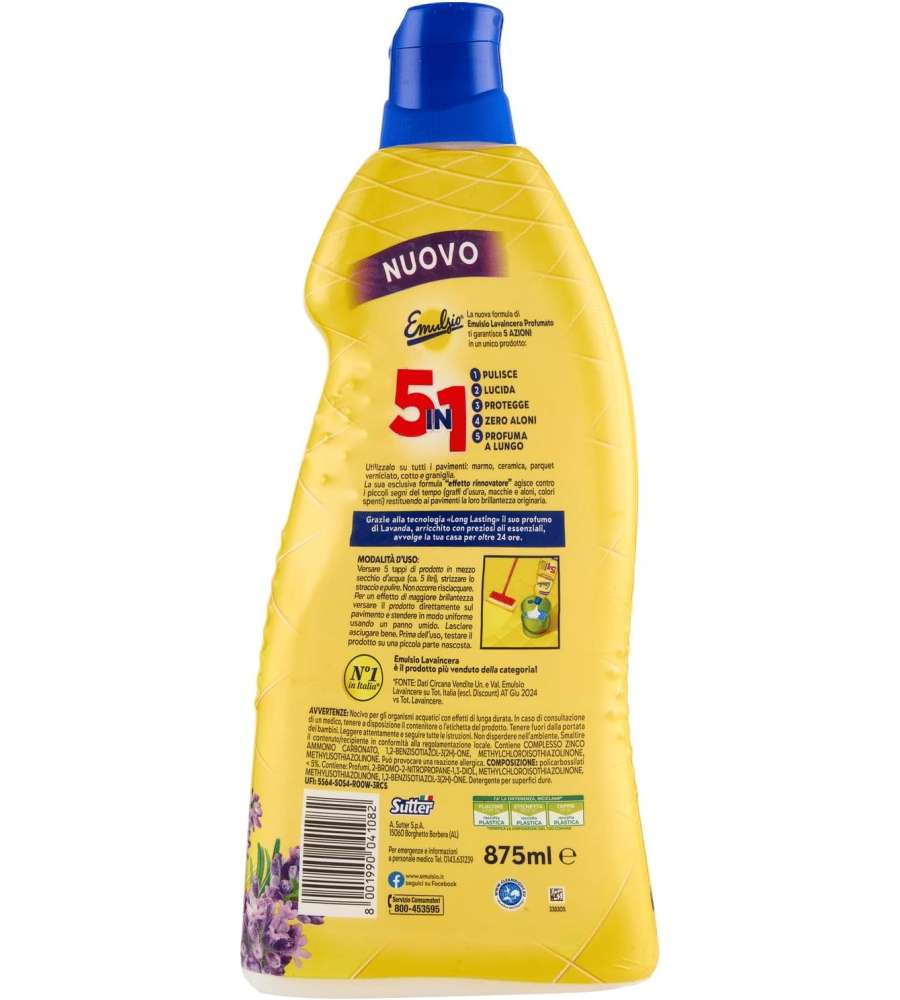 Descrizione: Scopri Emulsio Lavaincera Profumato, detergente pavimenti in formato 875ml. Ideale per una pulizia profonda, lascia una fresca fragranza e una finitura brillante. Perfetto per ogni tipo di pavimento!