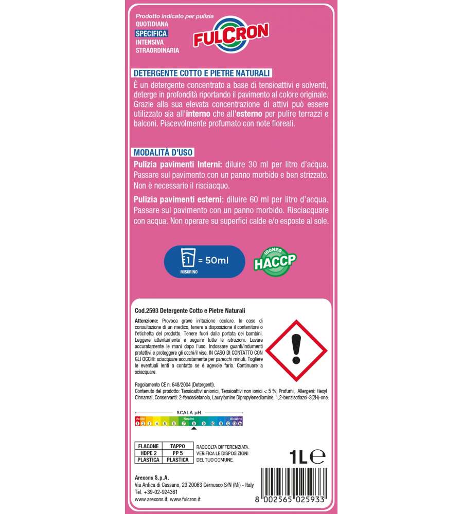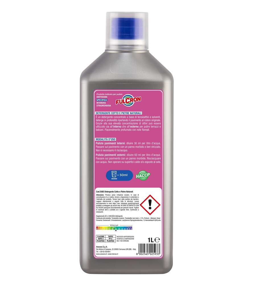 Detergente concentrato per pavimenti in cotto e pietre naturali, ideale per uso interno ed esterno. Pulisce in profondità, ravviva i colori e non richiede risciacquo. Profumazione floreale e formula naturale. Confezione da 1 litro.Indicato per: