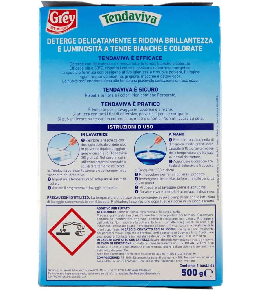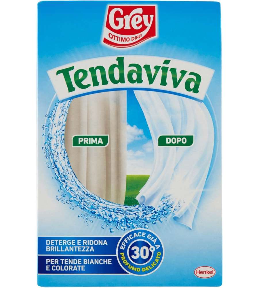 Descrizione: Scopri il Tendaviva Grey da 500g: un additivo per tende bianche e colorate che deterge e ridona brillantezza ai tessuti. Efficace già a 30°C, ideale per lavaggio in lavatrice e a mano.