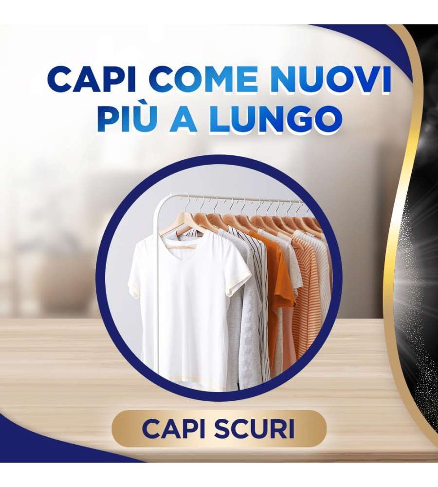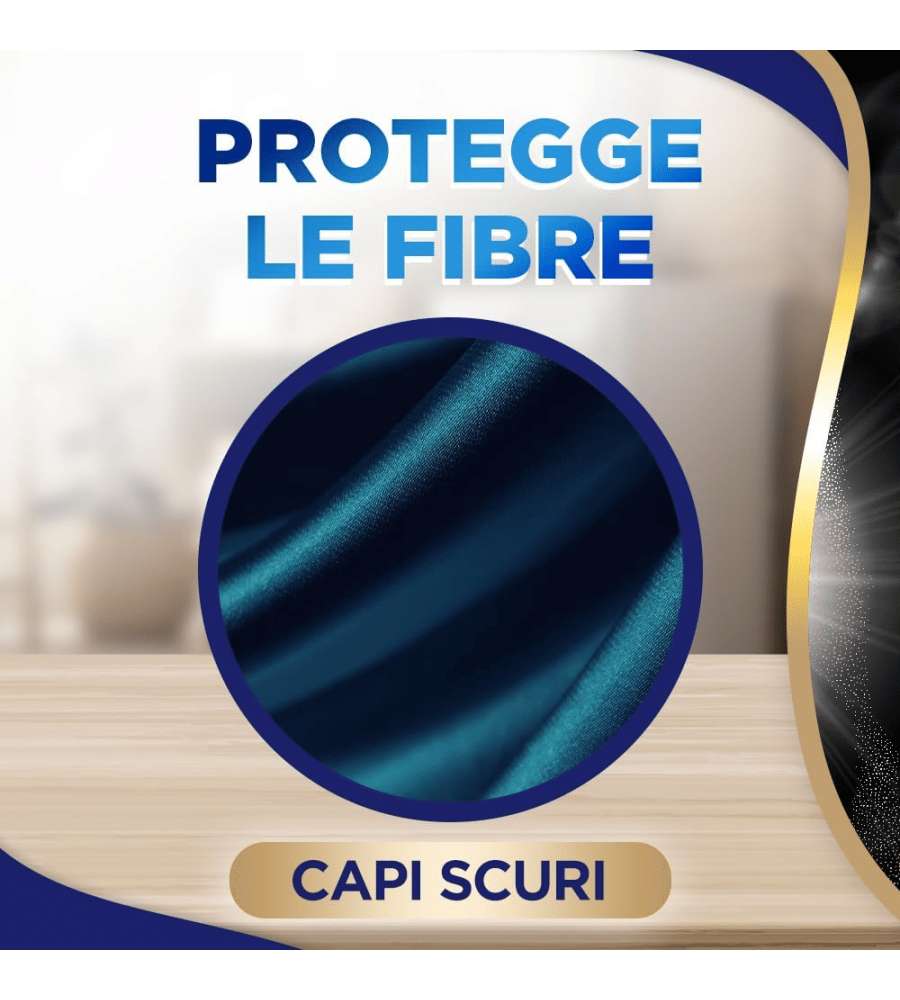 Detersivo liquido da 1500 ml per capi scuri, neri e jeans, con formula a base di cheratina. Garantisce 25 lavaggi, preserva l'intensità dei colori e cura i tessuti. Adatto per lavaggio a mano e in lavatrice. Profumo di brezza di mezzanotte.Capacità:
