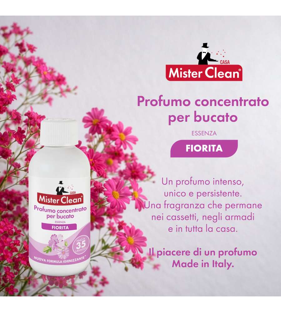 Mister Clean Profumo Concentrato Bucato Essenza Fiorita è l'alleato perfetto per chi desidera un bucato non solo pulito, ma anche avvolto in una fragranza floreale che dura nel tempo. Grazie alla sua formula concentrata, è possibile ottenere risultati ottimali con una quantità minima di prodotto, rendendo ogni lavaggio un'esperienza sensoriale unica. Perfetto per chi ama circondarsi di freschezza, questo detersivo è adatto a tutti i tipi di tessuti, garantendo un'azione delicata ma efficace. Utilizzalo per ogni lavaggio e scopri come i tuoi capi possono trasformarsi in un vero e proprio bouquet di profumi.