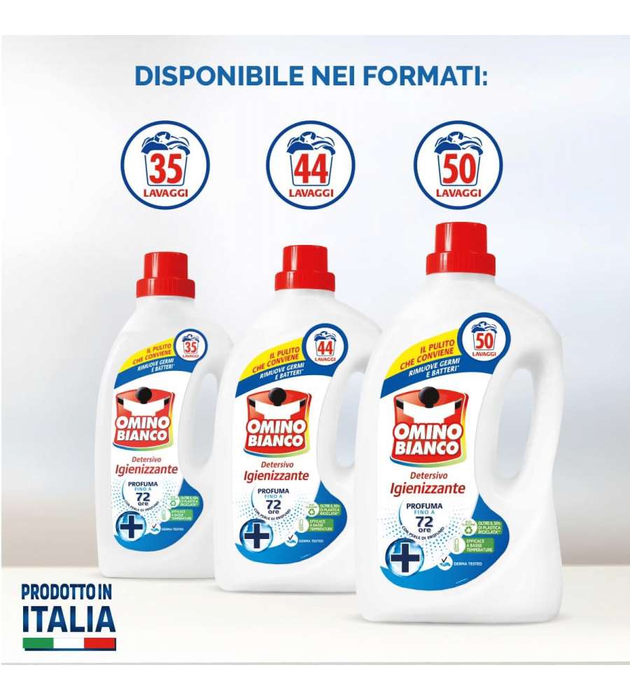 Descrizione: Detersivo lavatrice Omino Bianco 1400ml, igienizzante e profumato fino a 72 ore. Rimuove germi e batteri, efficace anche a basse temperature. Biodegradabile e sostenibile, flacone riciclabile.