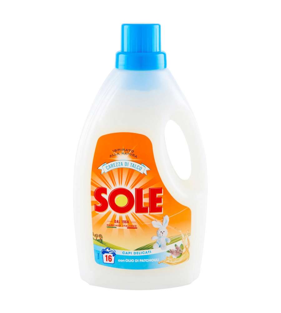 Descrizione: Detersivo Sole Carezza di Talco, 1L, ideale per capi delicati in lavatrice e a mano. Con oli naturali e balsamo ammorbidente, lascia i tessuti morbidi e profumati. Perfetto per 16 lavaggi.