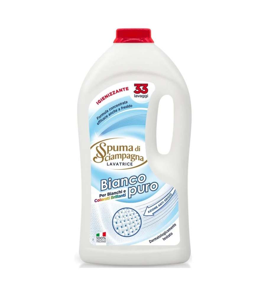 Descrizione: Scopri la Spuma Di Sciampagna Detersivo Lavatrice Liquido Bianco Puro: igienizzante e potente, per 33 lavaggi. Previene l'ingrigimento dei tessuti, garantendo un bucato impeccabile e brillante. Efficace anche a freddo.