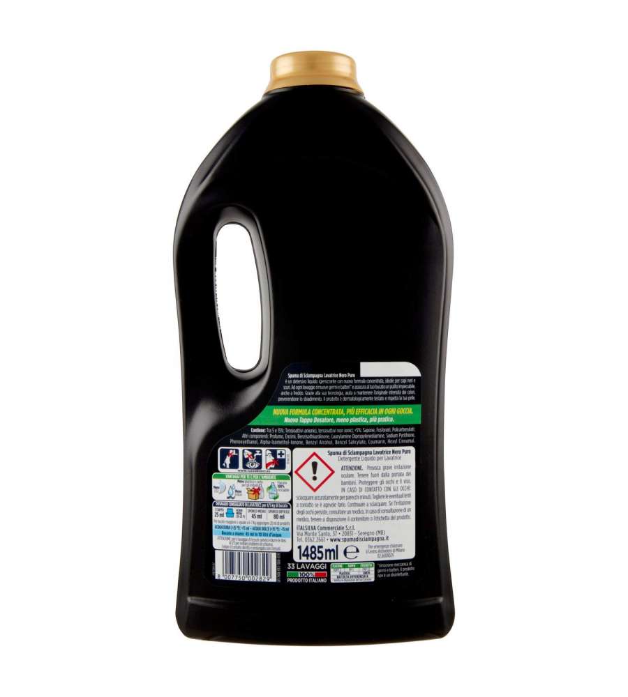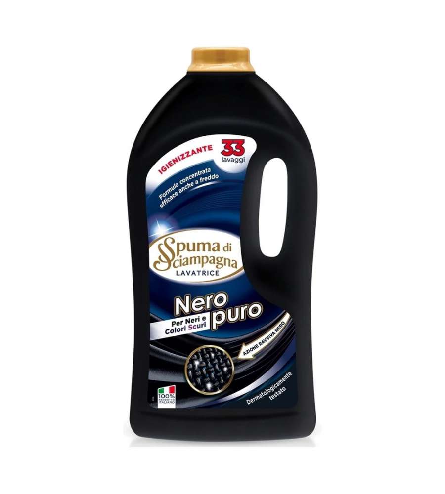 Descrizione: Detersivo Spuma di Sciampagna per lavatrice, specifico per capi neri e scuri. Formula concentrata per 33 lavaggi, protegge il colore e mantiene i tessuti morbidi. Ideale anche a freddo. Ravviva i tuoi colori!