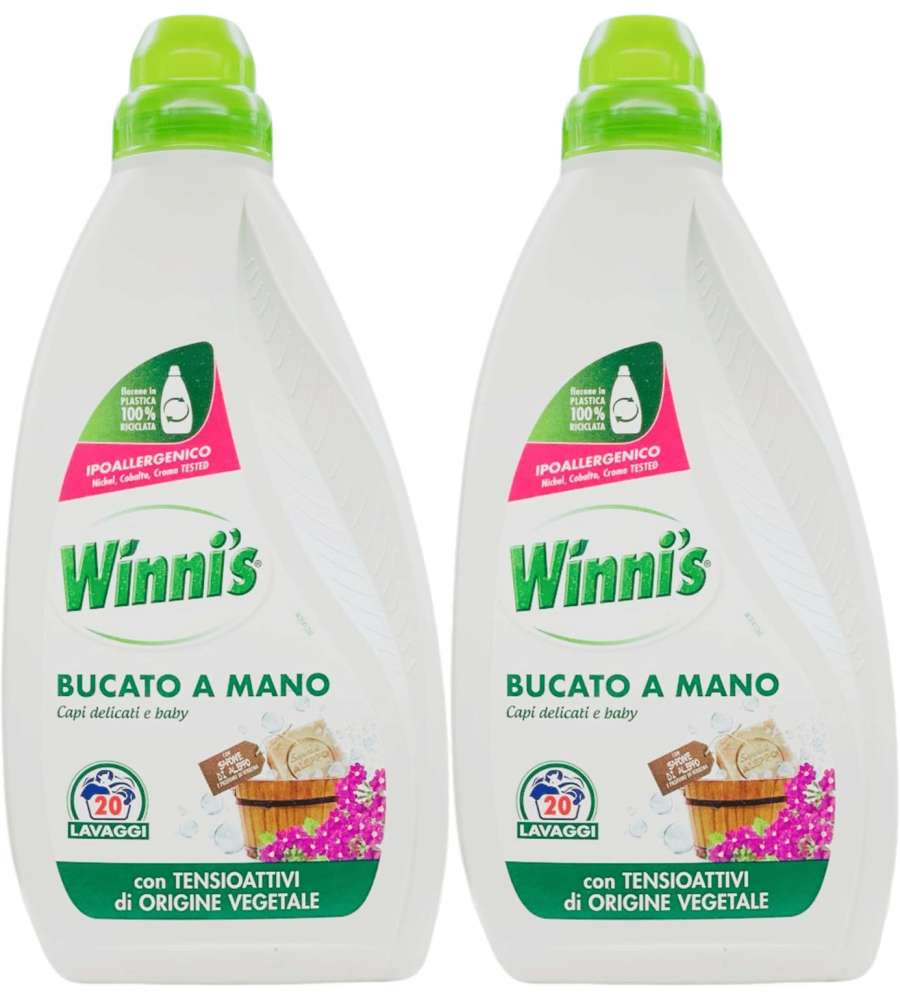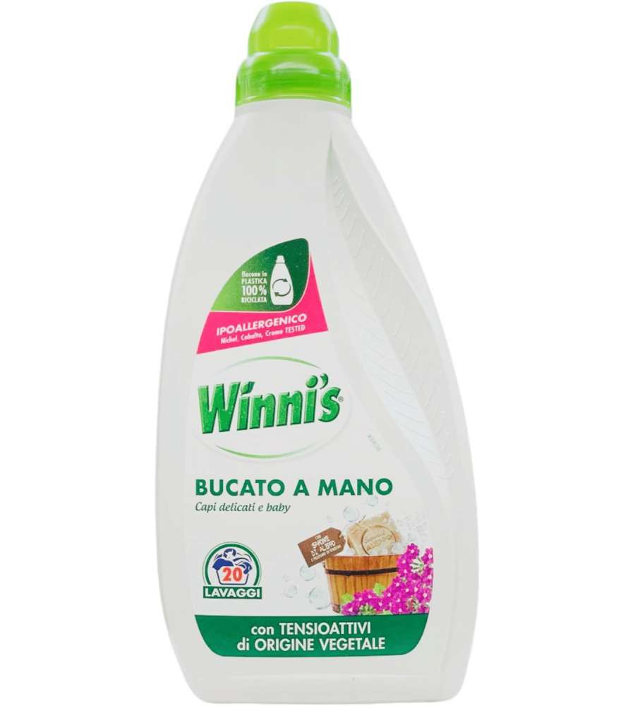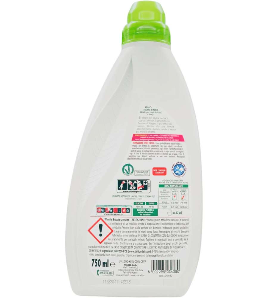 Descrizione: Scopri Winni's Detergente per Bucato a Mano da 750 ml, ipoallergenico e biodegradabile, ideale per capi delicati. Arricchito con sapone di Aleppo, garantisce freschezza e morbidezza in 20 lavaggi.
