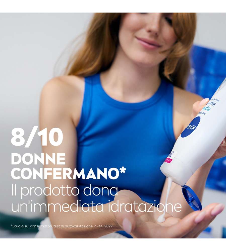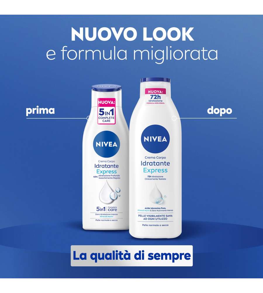 Crema corpo idratante NIVEA Express da 250 ml, arricchita con Acido Ialuronico Puro e Minerali Marini. Idrata per 72 ore, si assorbe rapidamente e rinforza le barriere naturali della pelle. Formula leggera, dermatologicamente testata.Composizione: