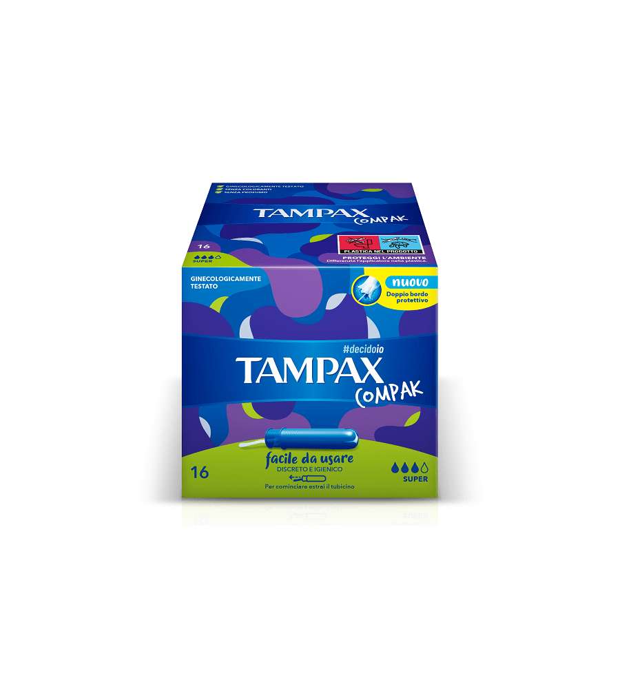 Assorbenti interni Tampax Compak Super, 16 pezzi, per protezione discreta e confortevole. Formato tascabile, facile da usare, con gonna protettiva antiperdite e microcanali assorbenti per una sicurezza ottimale durante il ciclo mestruale.Indicato per:
