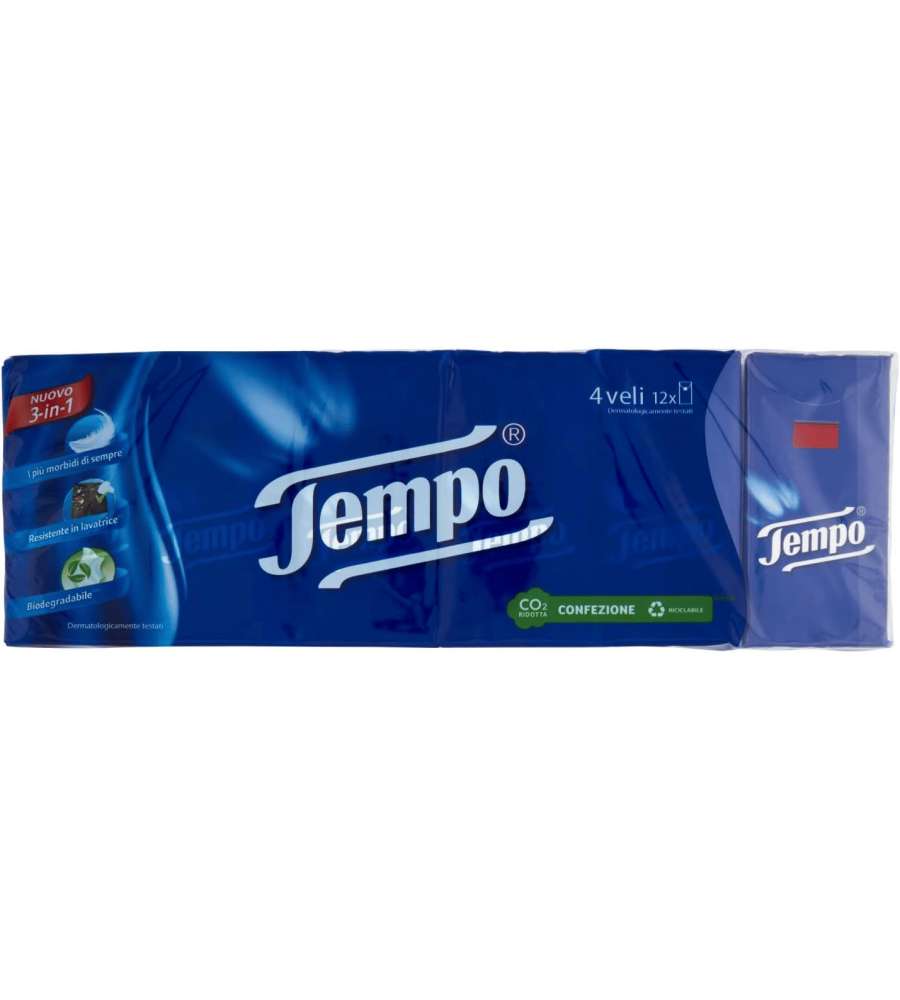 Descrizione: Fazzoletti Tempo a 4 veli, confezione da 12 pezzi, ultra morbidi e resistenti. Ideali per la pulizia quotidiana, resistono ai lavaggi in lavatrice. Un classico da avere sempre in tasca!