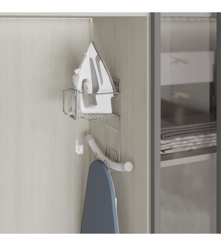 Il supporto organizzatore è dotato di un cestino per posizionare il ferro da stiro e di ganci per fissare il tavolo da stiro in modo che non si muova.Altro 1: