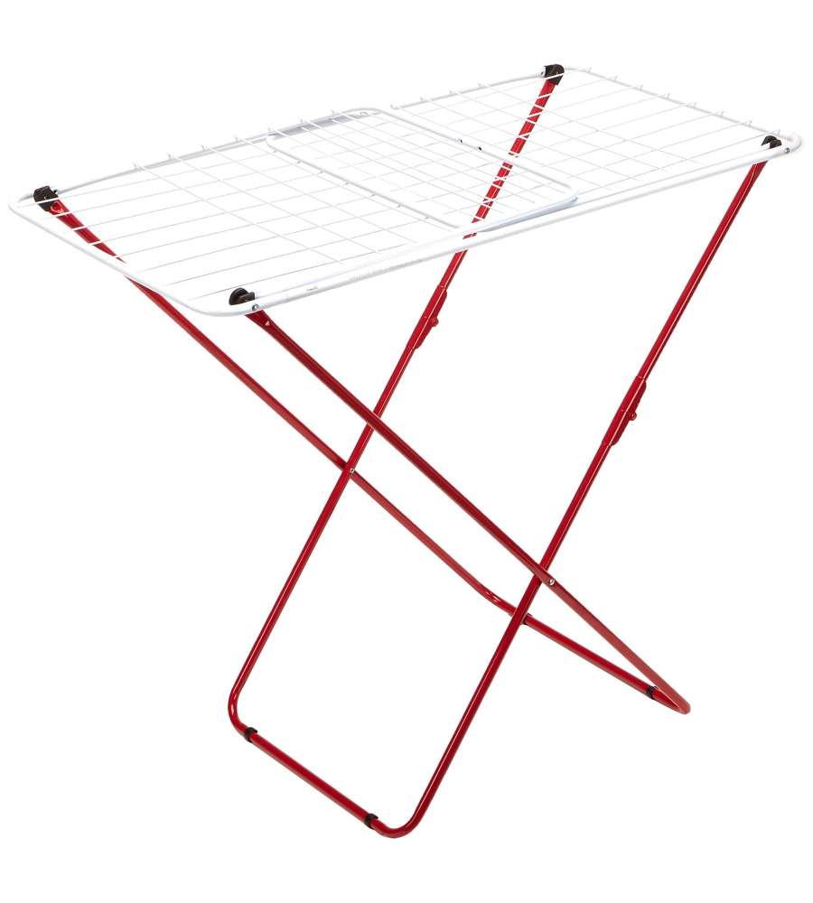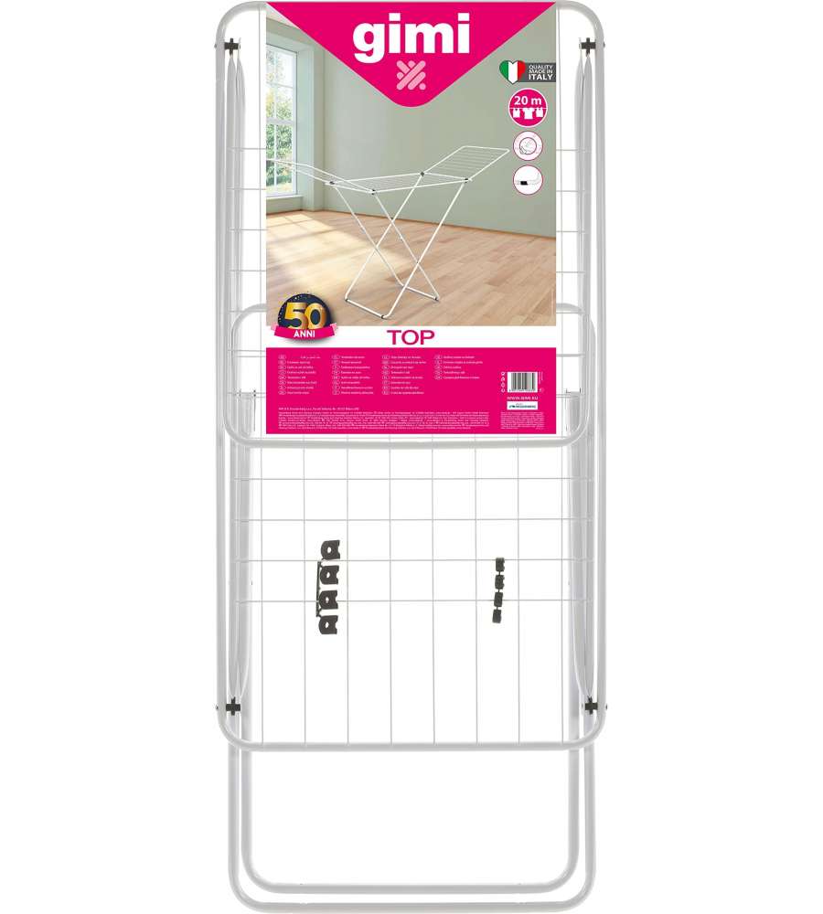 Stendipanni Gimi con telaio in acciaio, leggero (2,9 kg) e resistente. Progettato per stendere fino a 20 metri di biancheria, include alette laterali estensibili. Facile da riporre e adatto per interni ed esterni.Capacità: