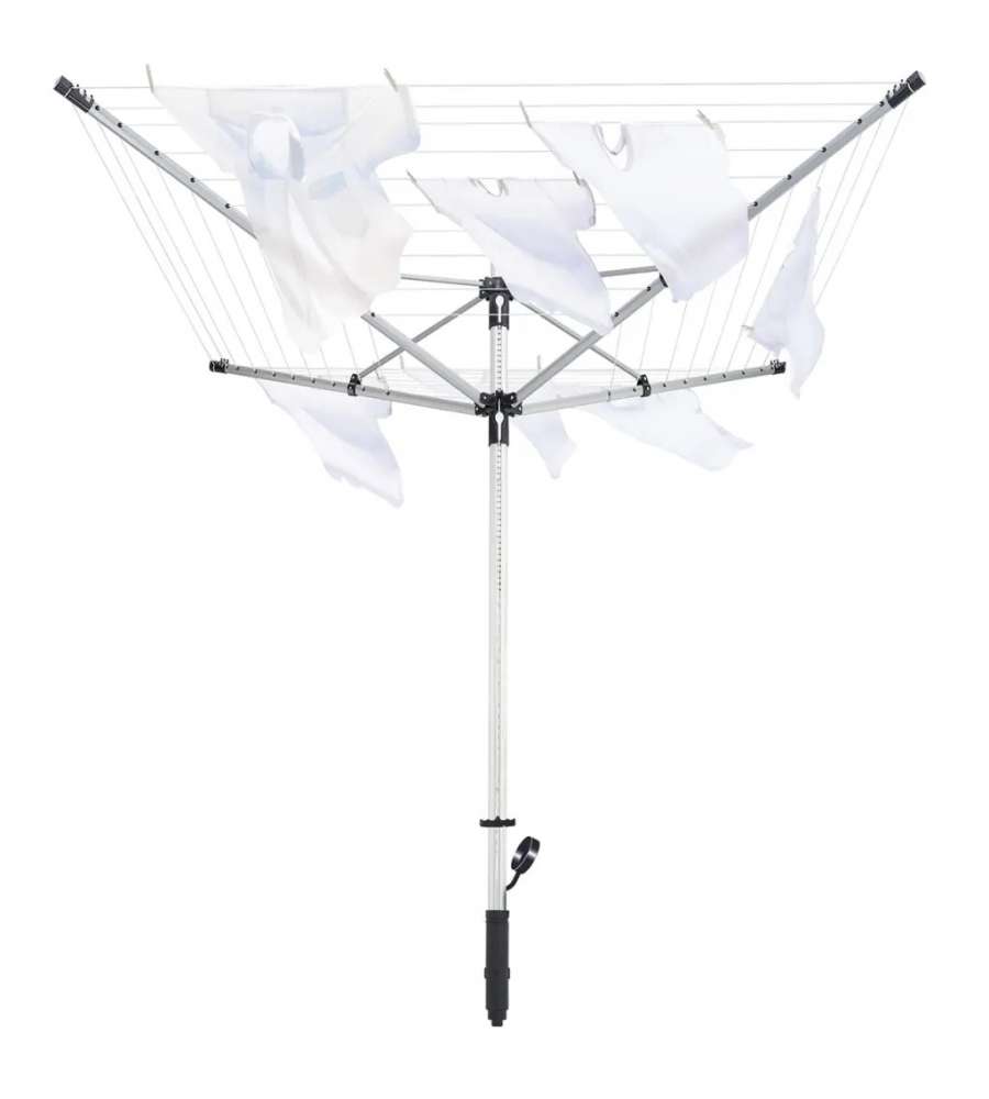 Lo stendibiancheria a ombrello offre spazio per cinque carichi di lavatrice, e può essere aperto velocemente e comodamente per mezzo di una corda da tirare. L'altezza del filo può variare facoltativamente tra 85 e 180 cm. 12 ganci sui bracci di supporto consentono di asciugare T-shirt, camicette e camicie poste su un appendiabiti. Il supporto in acciaio e il forte palo centrale mantiene lo stendibiancheria rotante stabile, anche se a pieno carico.