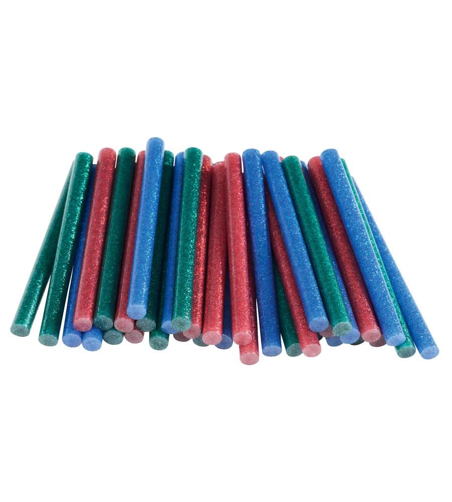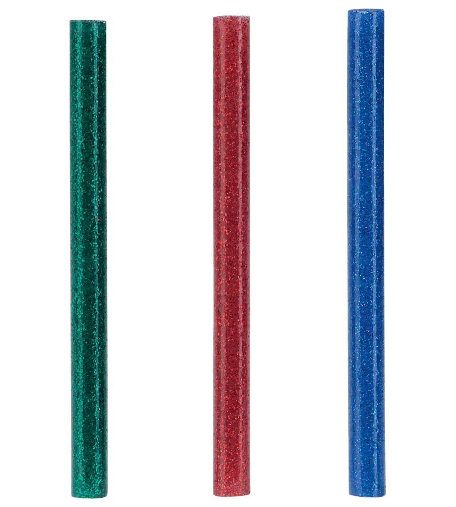 Colla a caldo glitter in blister da 36 stick, diametro 7 mm x 90 mm. Colori brillanti: rosso, blu e verde. Alta qualità di incollaggio grazie all'elevata percentuale di resina. Senza solventi e non irritante, ideale per decorazioni.Garanzia: