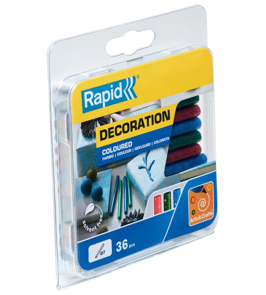Descrizione: Colla a caldo glitter Rapid in blister da 36 stick, diametro 7 mm. Colori brillanti: verde, rosso e blu. Ideale per decorazioni e assemblaggi, senza solventi e non irritante. Incollaggio rapido e durevole.