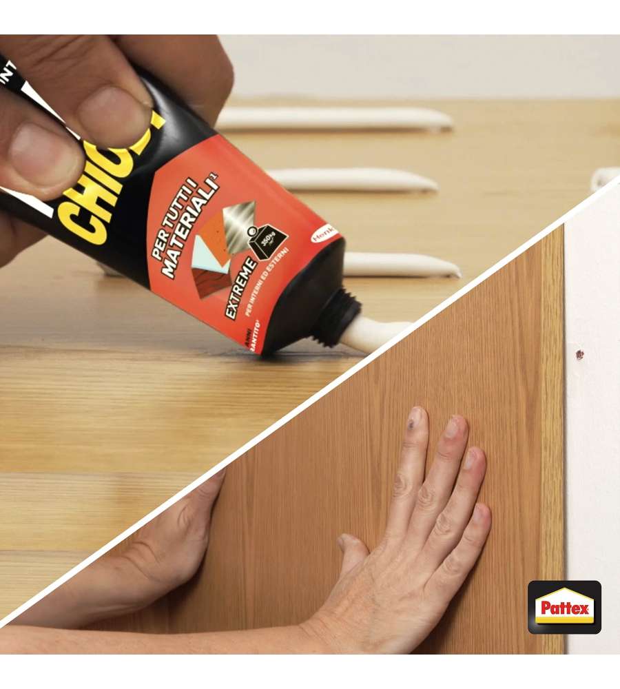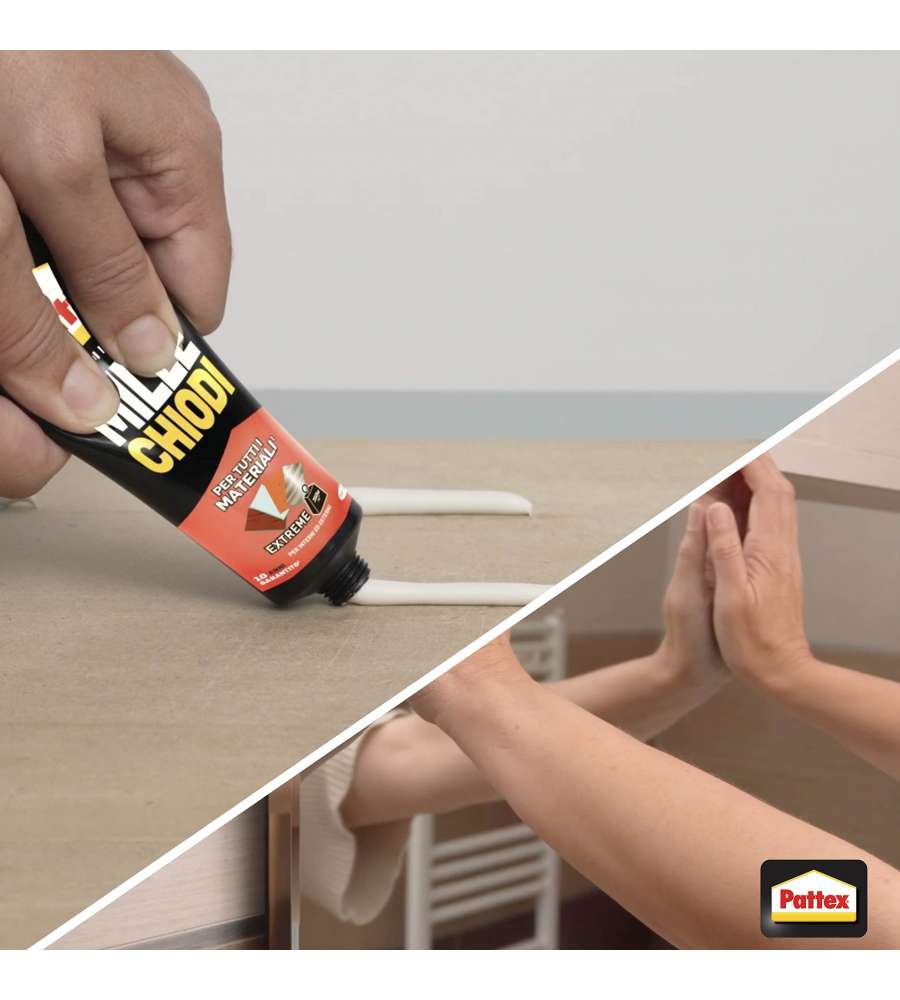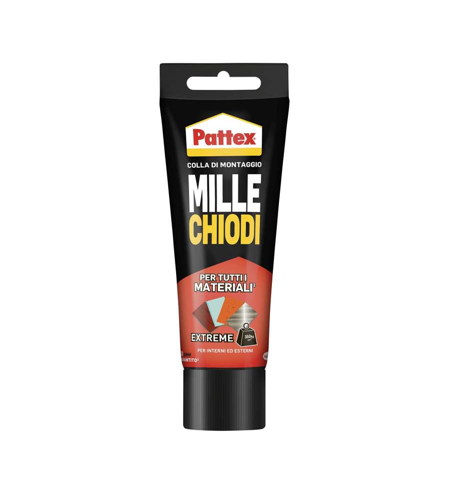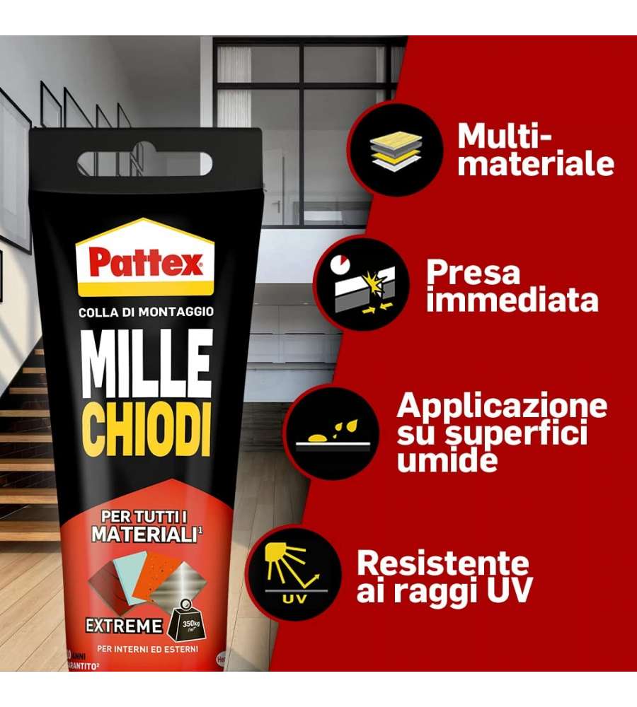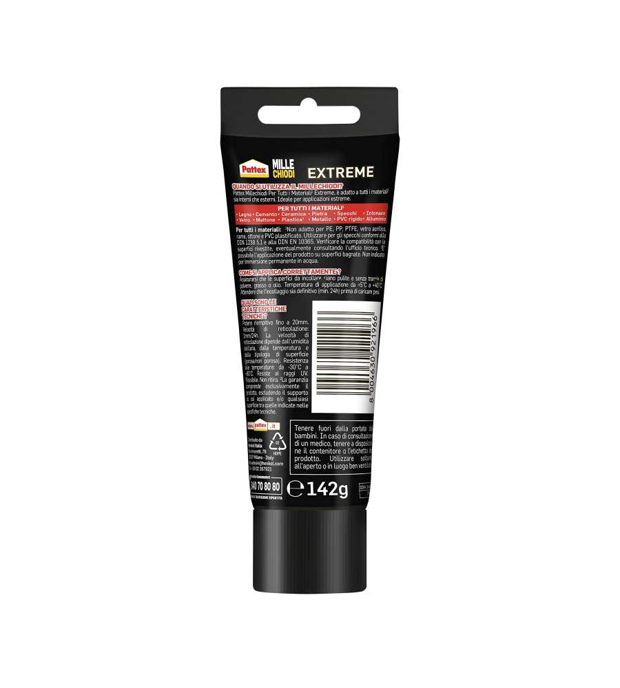 Adesivo di montaggio Pattex Millechiodi Extreme, 142g, impermeabile e resistente ai raggi UV. Ideale per applicazioni estreme, supporta fino a 350kg/m2. Riposizionabile per 10 min, ottimo per pannelli rigidi e piani di lavoro.Portata massima: