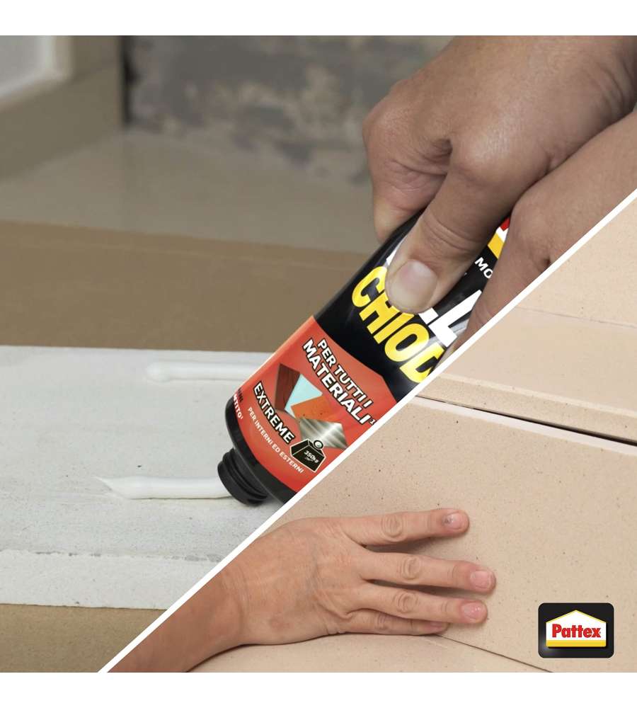 Descrizione: Pattex Millechiodi Extreme è un adesivo di montaggio potente e versatile, ideale per applicazioni estreme. Resistente all'acqua e ai raggi UV, supporta fino a 350kg/m². Perfetto per fissare pannelli rigidi e piani di lavoro.