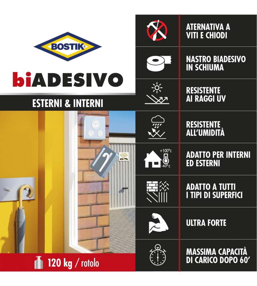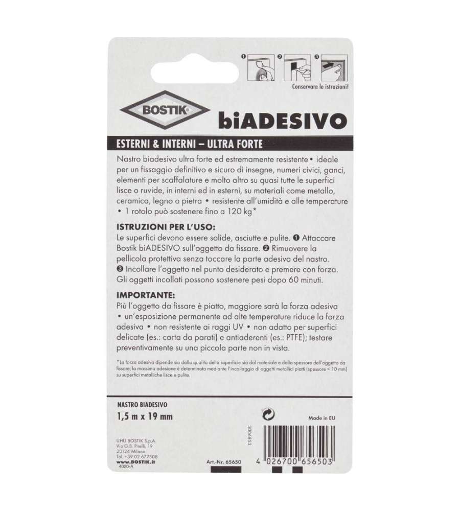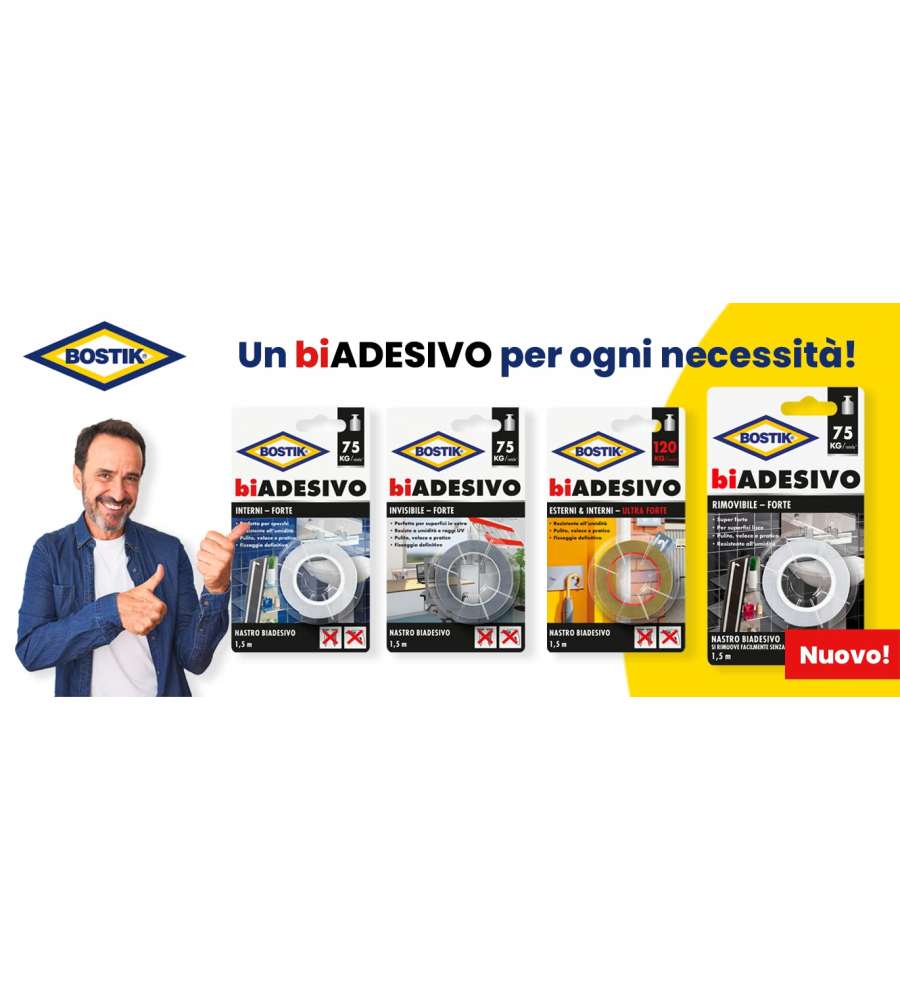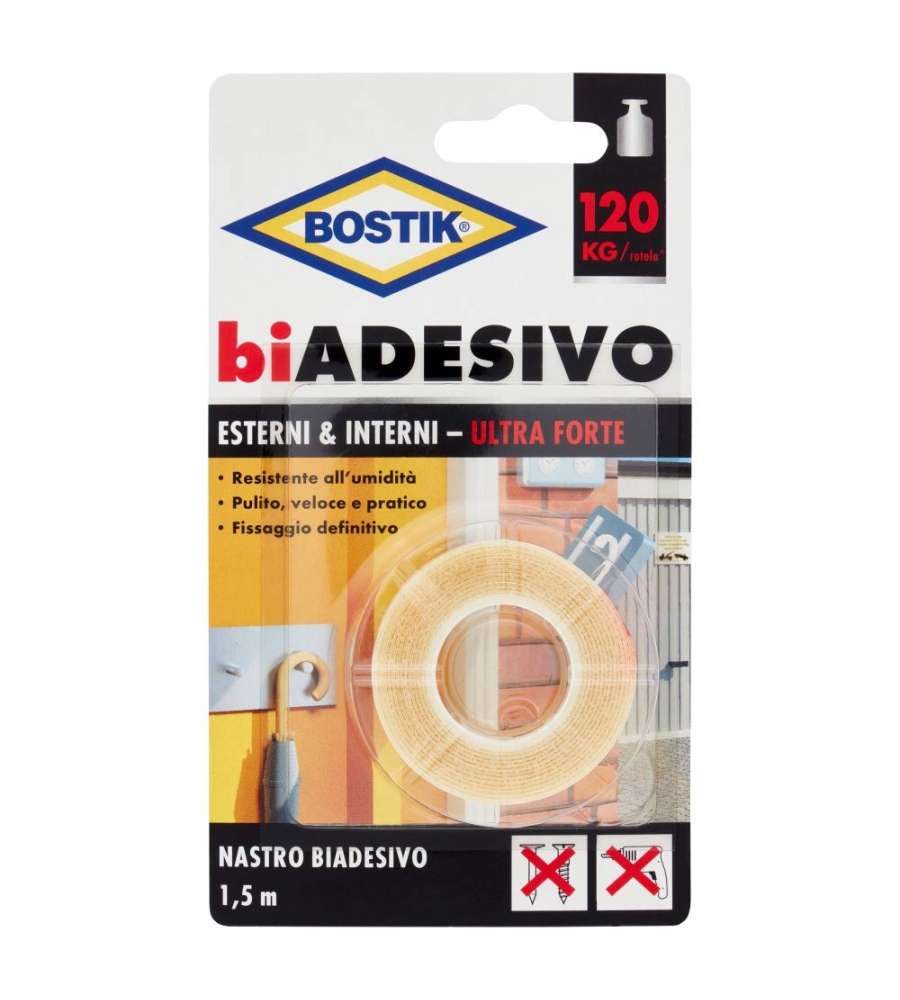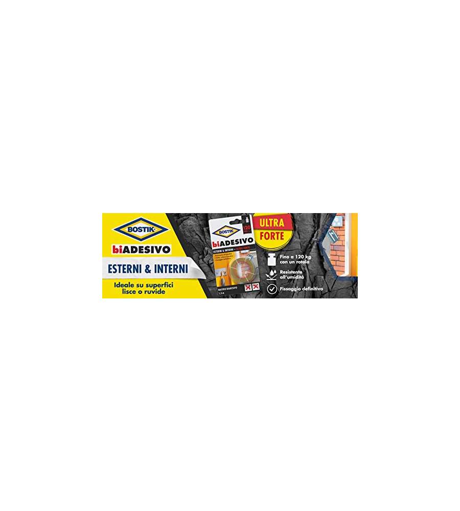 Descrizione: Nastro biadesivo Bostik 1,5m, ultra forte e resistente all'umidità. Ideale per interni ed esterni, si adatta a superfici lisce e ruvide. Facile applicazione, ottimo per fissaggi e montaggi.