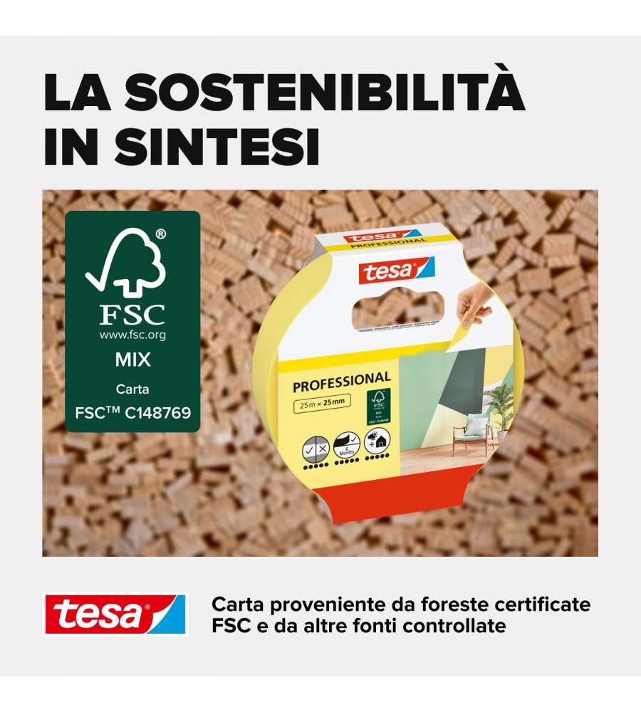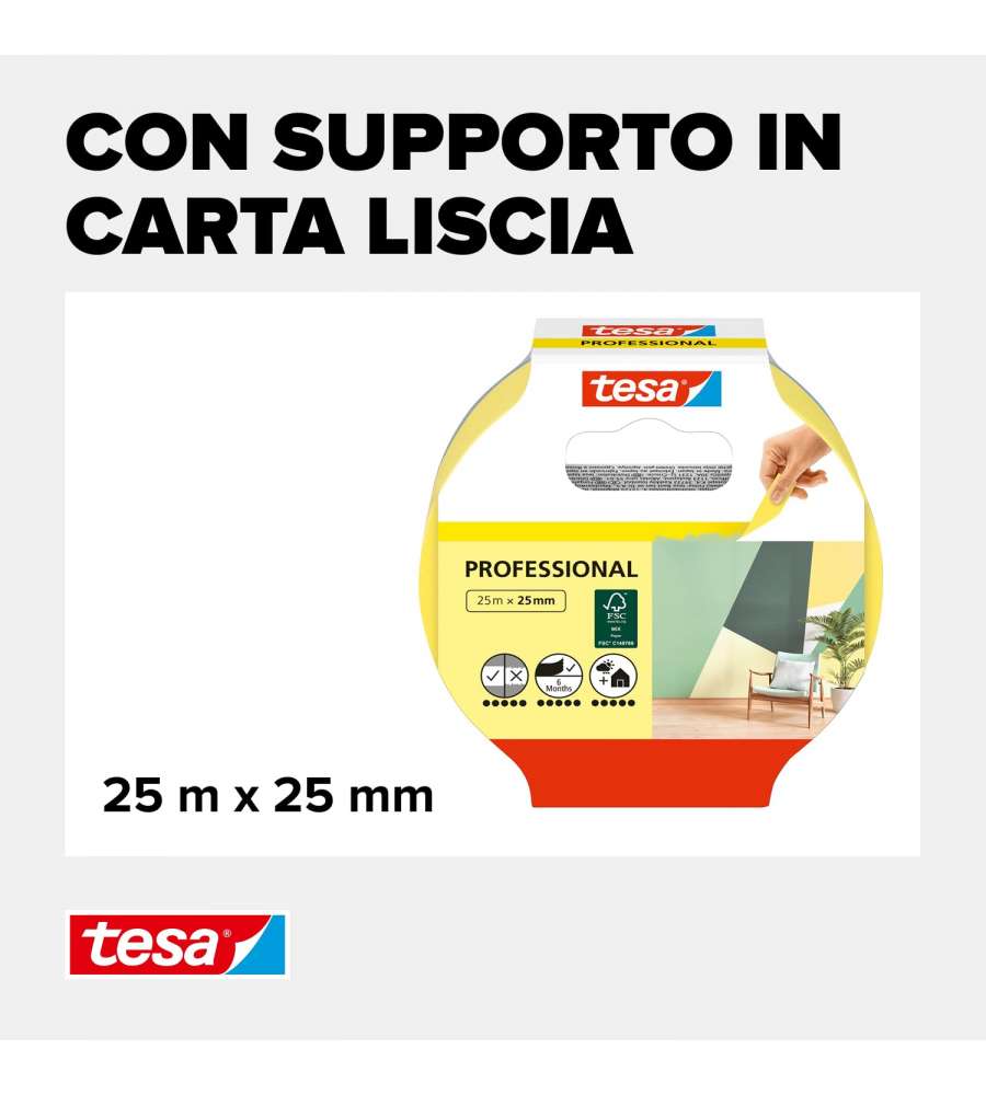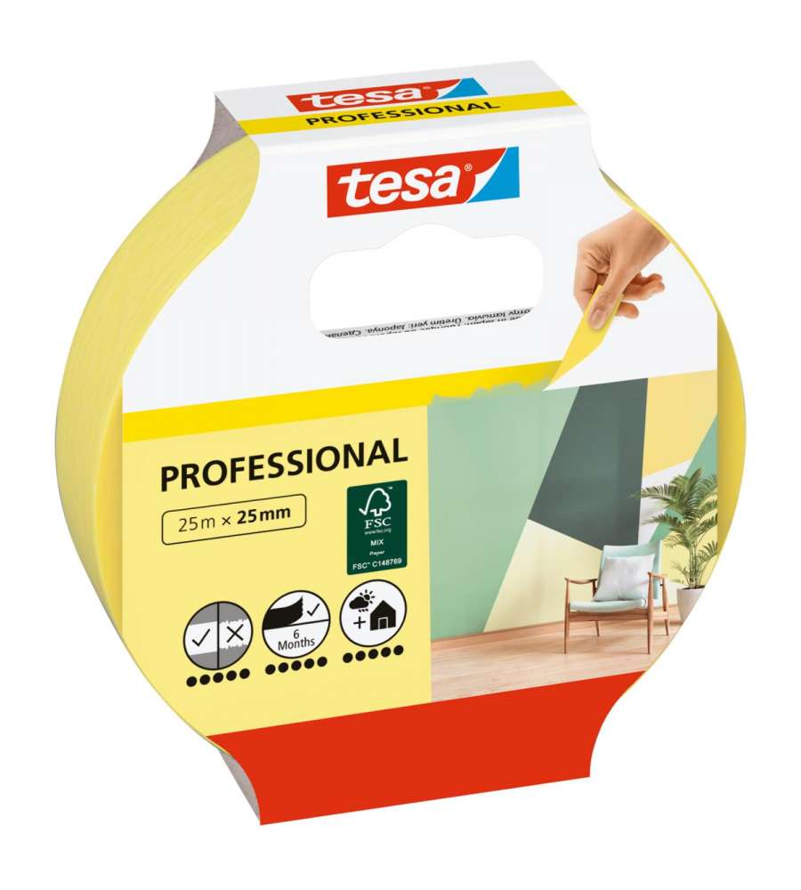 Descrizione: Nastro per mascherature Tesa Professional in carta Washi, 25 m x 25 mm. Alta adesione e bordi perfetti per pittura precisa. Rimozione senza residui fino a 6 mesi. Ideale per interni ed esterni.