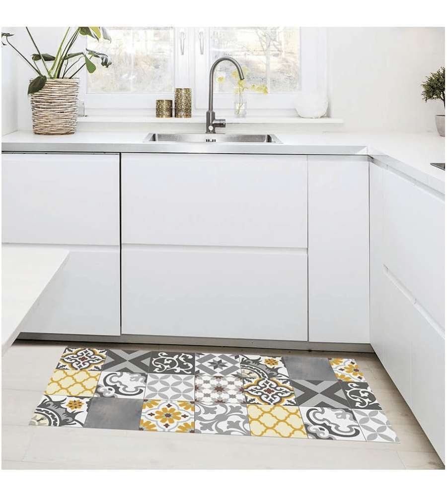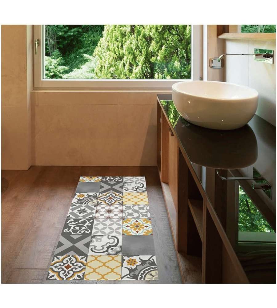 Tappeto in vinile imbottito CROMA Patch, misure 50x110 cm. Colori grigio e ambra, design geometrico per un tocco moderno. Facile da pulire, ideale per interni. Leggero e resistente, perfetto per spazi compatti.Destinazione d'uso: