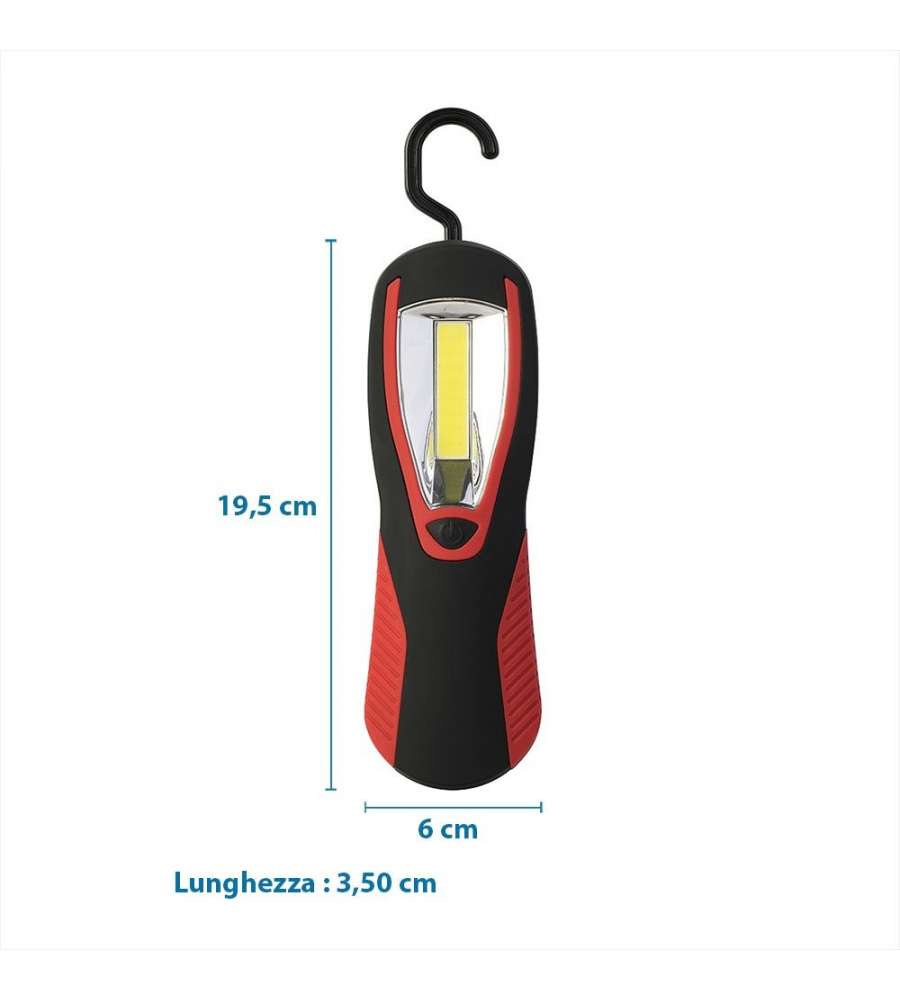 Lampada LED portatile ricaricabile da 12V, 200LM, con luce ultra LED COB. Design compatto (6x3.5x19.5 cm), peso leggero (100g). Gancio girevole a 360°, resistenza all'acqua, ideale per officina, campeggio e uso domestico.Destinazione d'uso: