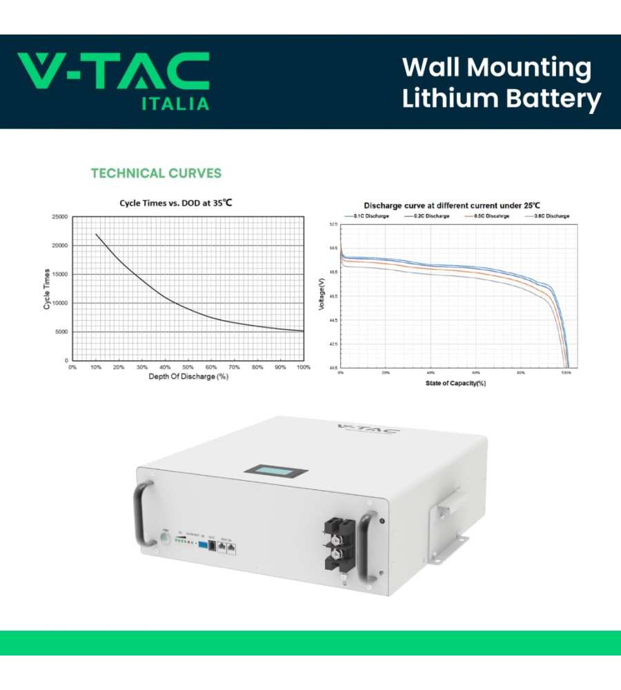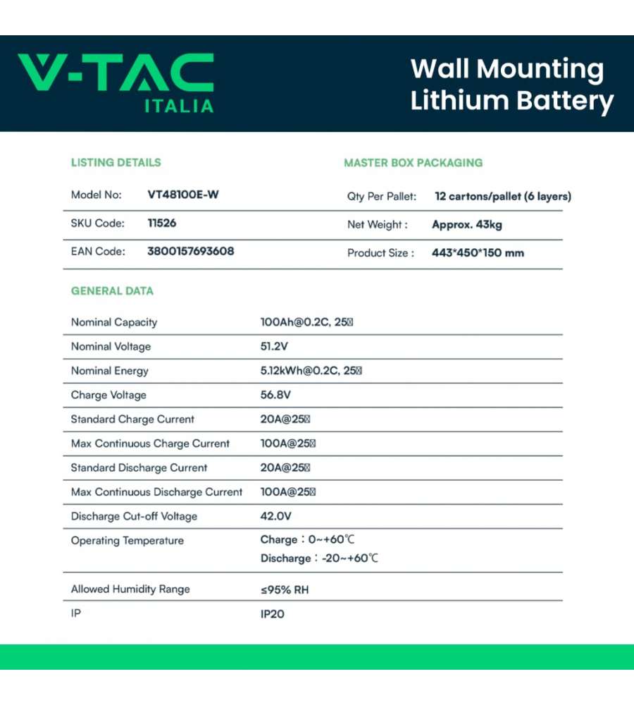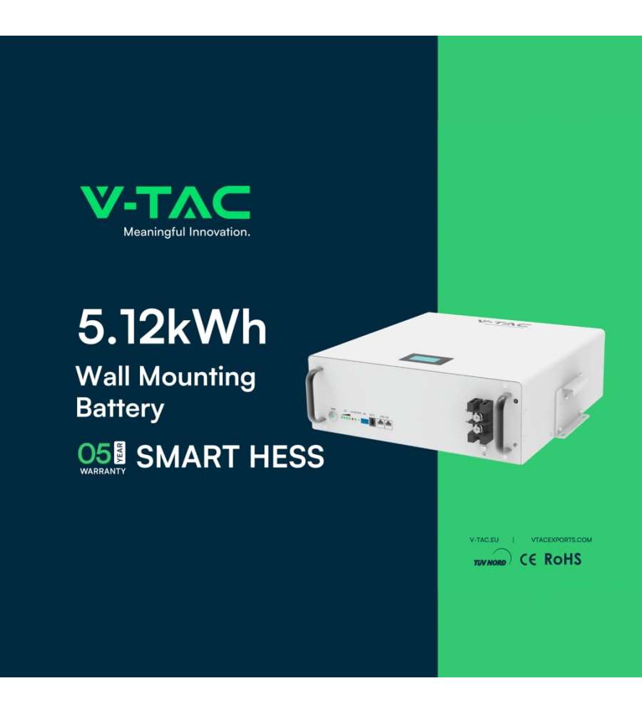 Descrizione: Batteria di accumulo V-TAC 5kWh LFP con BMS integrato, ideale per impianti fotovoltaici. Ricaricabile, garantita 10 anni, resiste a oltre 6000 cicli. Compatta e facile da installare.
