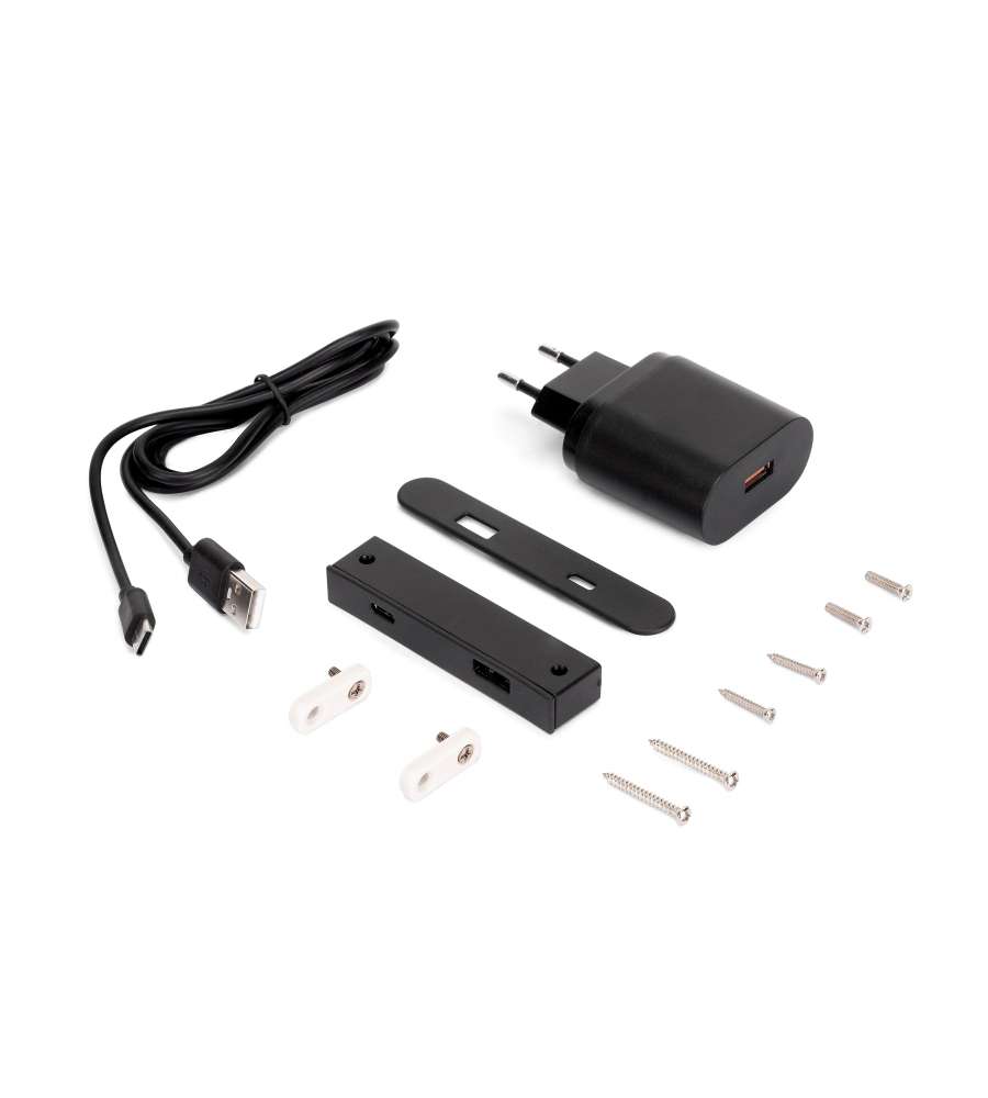 1 base di ricarica, 1 cavo USB da 1,8 m, 1 caricabatterie da parete, 1 coperchio da incasso, 1 coperchio da superficie, viti e dispositivi di fissaggio.Caratteristiche: