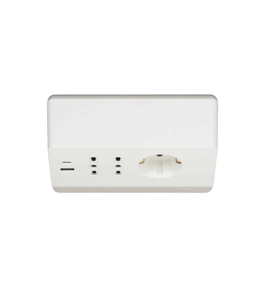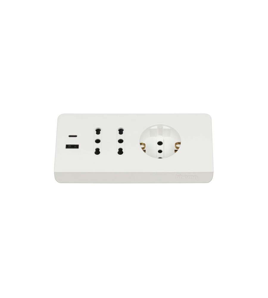 Descrizione: Multipresa da scrivania Bticino con 2 prese 2P+T (10/16A), 1 presa tedesca P30 e 2 USB A+C. Cavo da 2 m e interruttore di sicurezza. Ideale per casa e ufficio, compatto e funzionale.