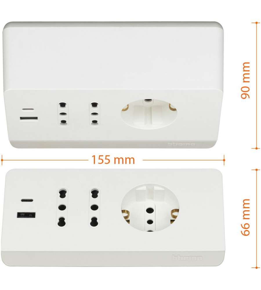 Multipresa da scrivania Bticino con 2P+T 10/16A, 1 presa P30, 2 USB (tipo A+C), interruttore di sicurezza, cavo 2m e spina salvaspazio. Design compatto, ideale per casa e ufficio. Colore bianco, dimensioni 155x66x90mm.Destinazione d'uso: