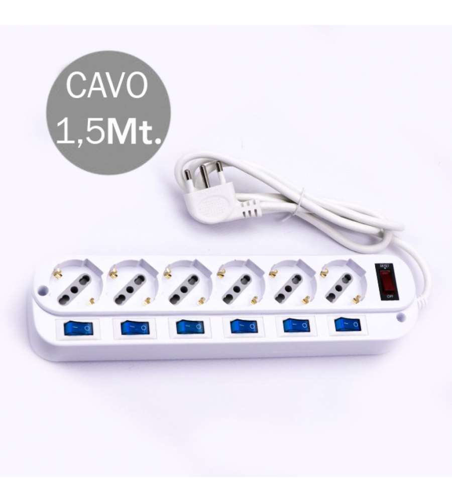 Multipresa con Cavo 1,5mt 6 Prese 10/16A 2P+T Bipasso + Shuko a 45° Interruttore Generico 6 Singoli Spina 16A 2P+T