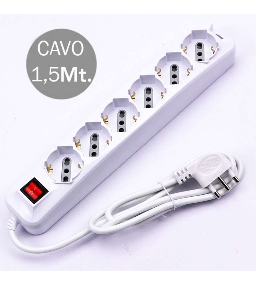 Multipresa con Cavo 1,5mt 6 Prese 10/16A 2P+T Bipasso + Shuko Interruttore Luminoso Spina 16A 2P+T Colore Bianco