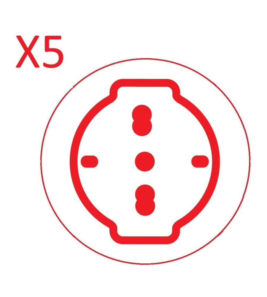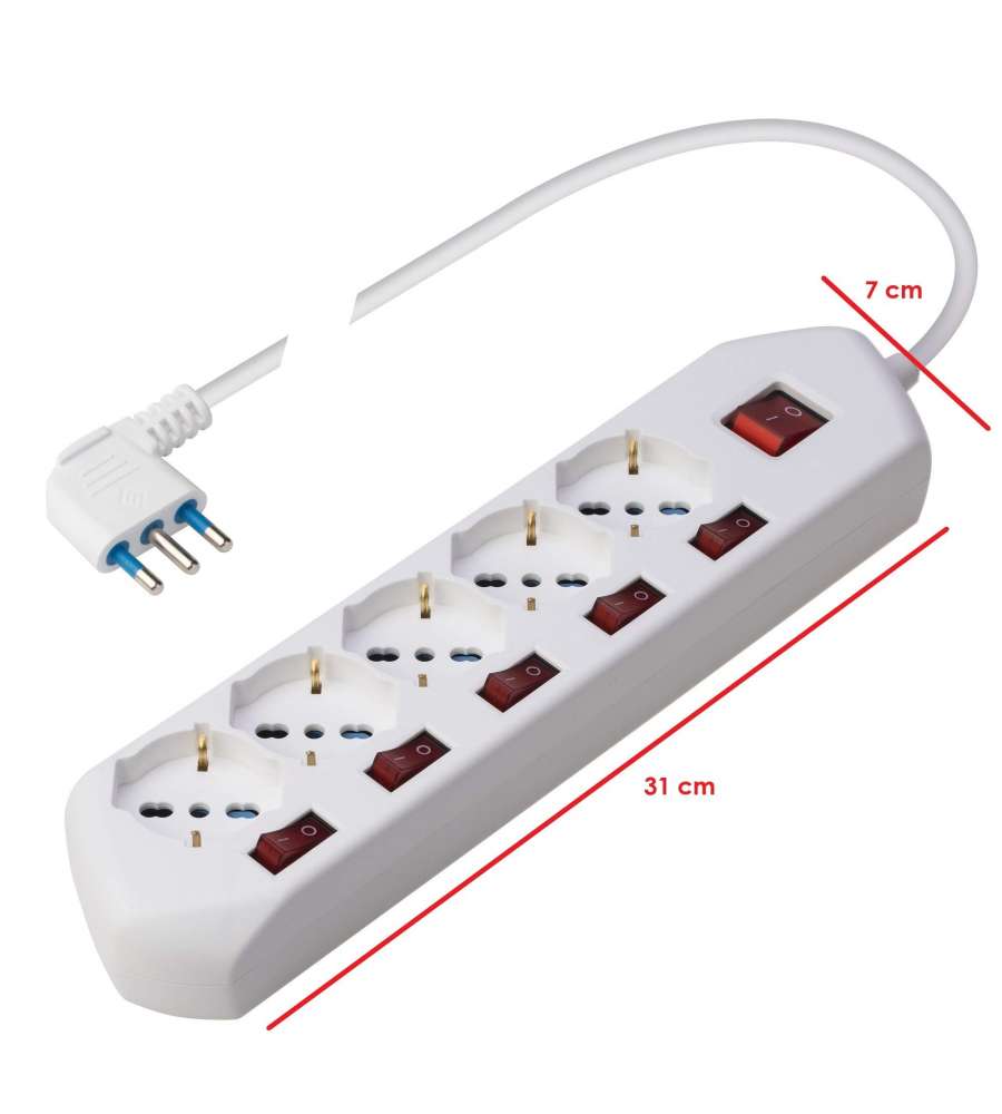 Presa multipla bianca 250 V con 5 prese pluristandard 10/16 A, cavo di 1,5 m, interruttore luminoso e 5 interruttori singoli. Uscita cavo a 90°, supporta un carico massimo di 3500W complessivi. Ideale per uso domestico, certificato CE.Destinazione d'uso: