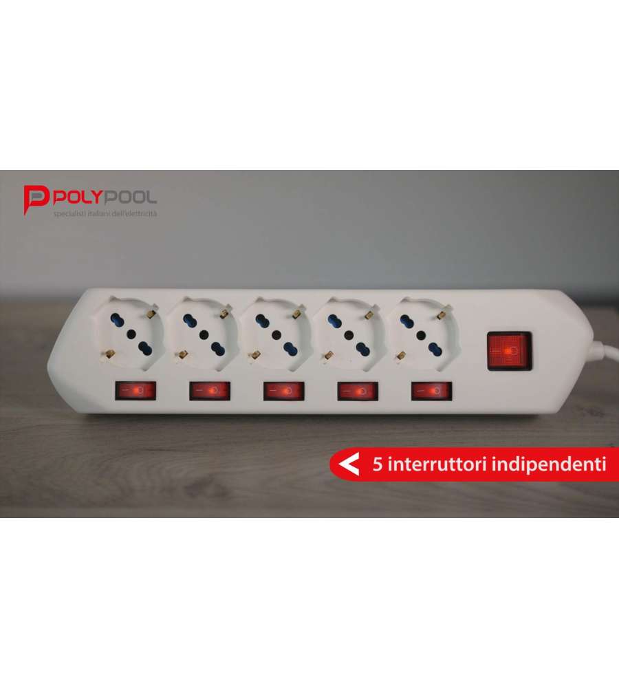 Descrizione: Presa multipla bianca Poly Pool, spina 16A 250V con 5 prese 10/16A 2P+T. Cavo di 1,5m, interruttore luminoso generale e interruttori singoli. Ideale per uso domestico.