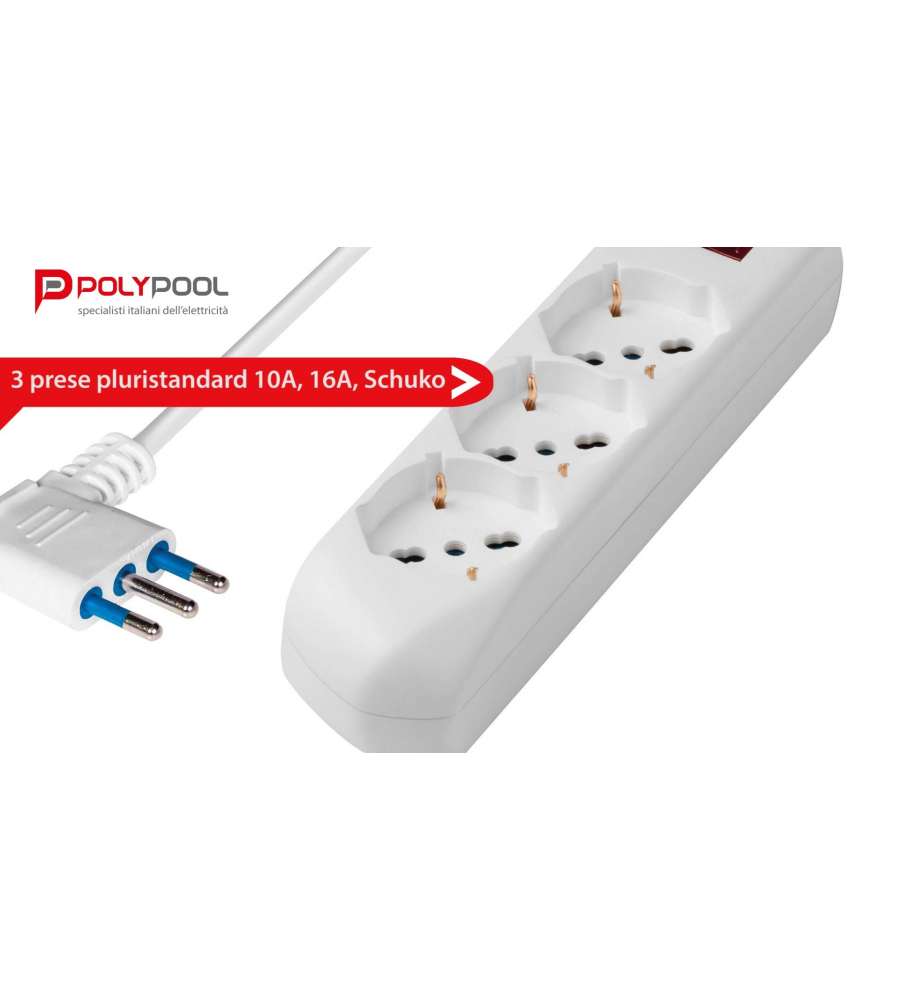 Descrizione: Multipresa tripla bianca Poly Pool 10/16A con cavo 1,5 m. Tre prese pluristandard inclinate a 45° per un facile collegamento, adatte per tutte le spine standard italiano e tedesco. Interruttore di sicurezza per protezione sovraccarico.