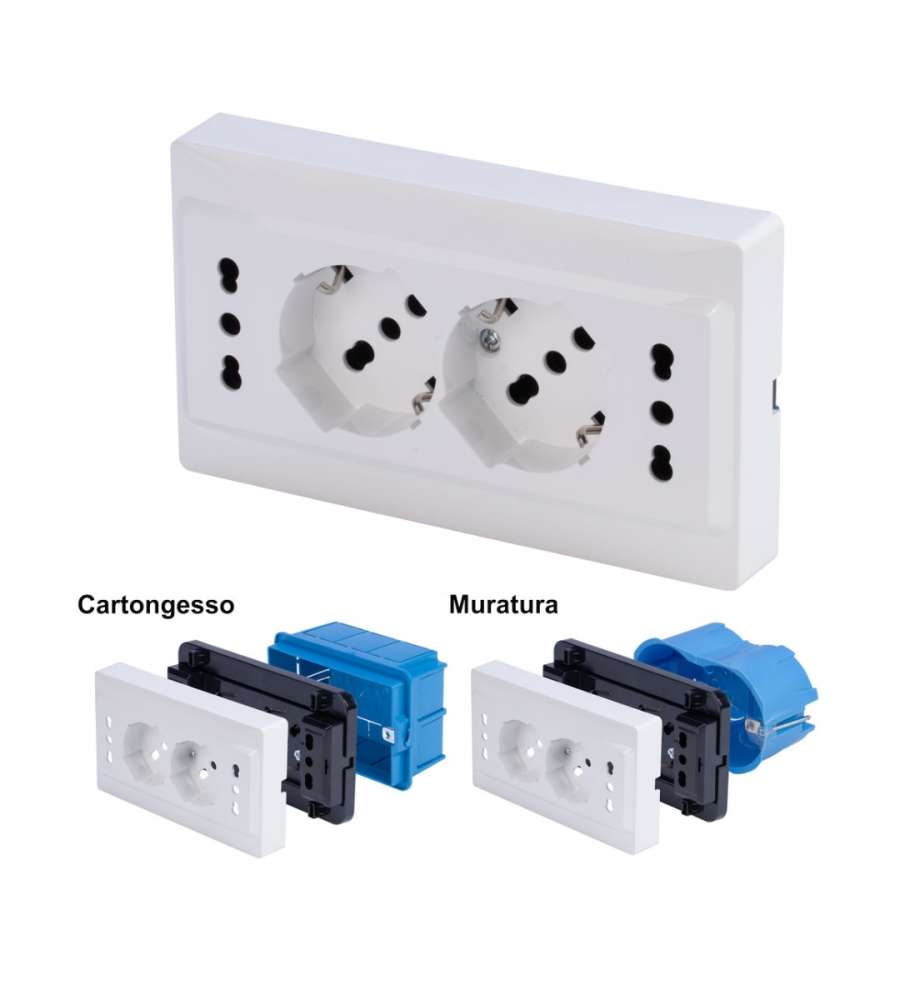 Presa multipla da incasso con 2 prese standard 10/16A e 2 pluristandard, 250V~, ideale per muratura o cartongesso. Ingombro ridotto e cablaggio semplice, ottima per aumentare i punti di alimentazione domestica.Destinazione d'uso: