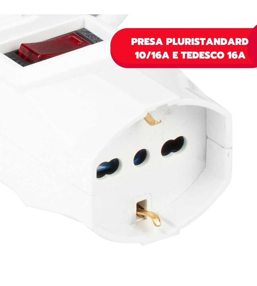 Prolunga elettrica 10m, 250V, con presa pluristandard 10/16A e spina salvaspazio. Dotata di interruttore di sicurezza per sovraccarico, cavo H05VV-F 3x1mm² e risparmio energetico. Colore bianco, ideale per dispositivi italiani e tedeschi.Destinazione d'uso: