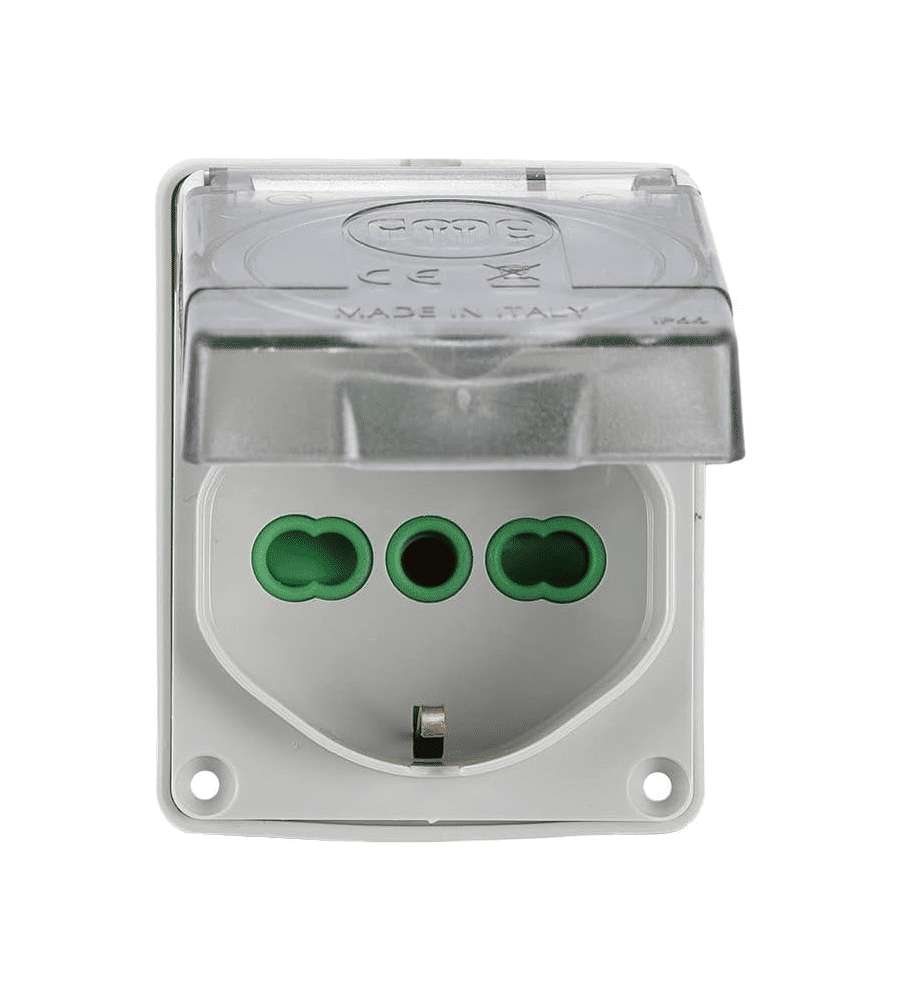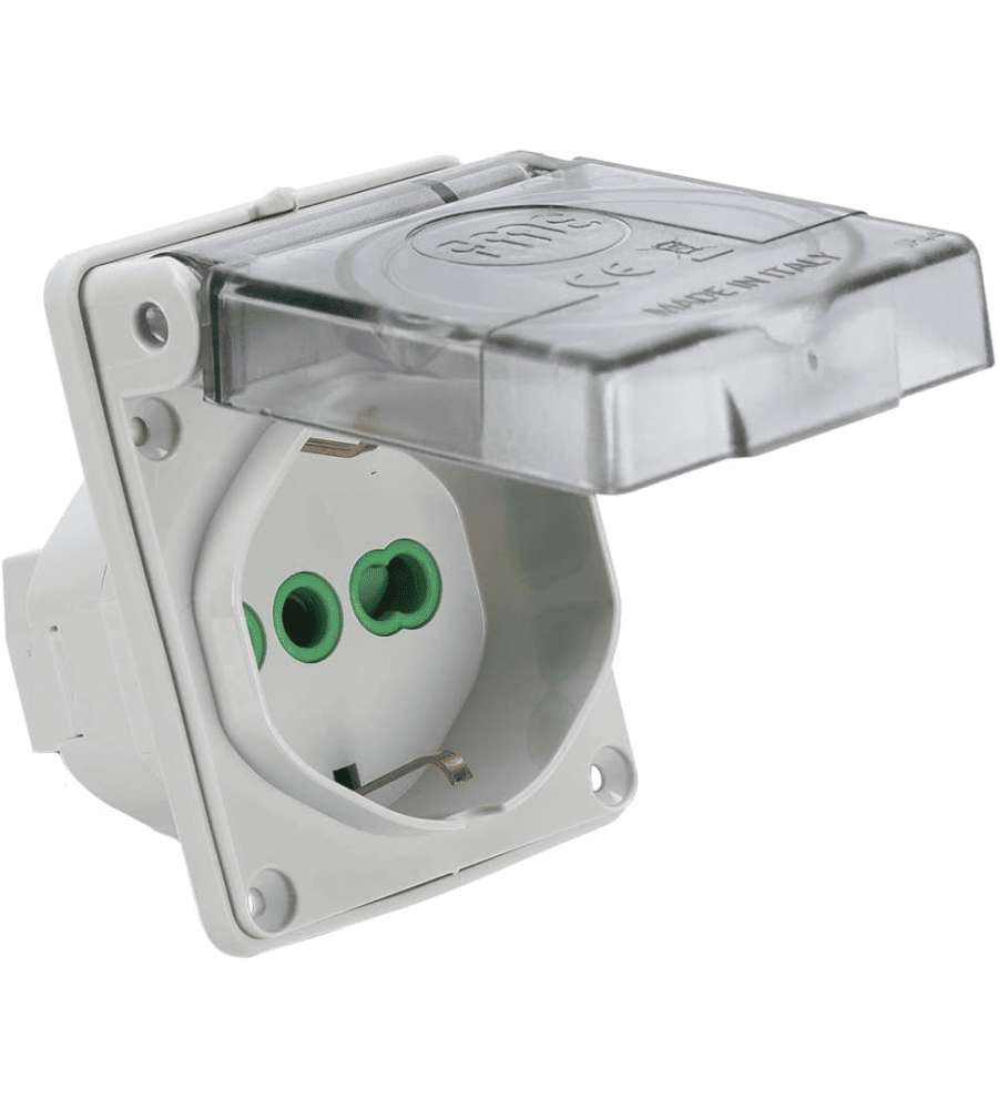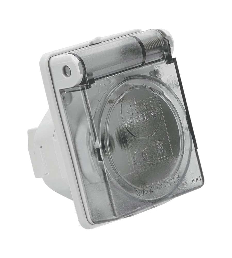 Descrizione: Presa da incasso Fanton P40, IP44, 53x65 mm. Compatta e versatile, adatta per ambienti interni ed esterni. Supporta spine bipasso 2P+T 16A. Design moderno e resistente, ideale per spazi ristretti.