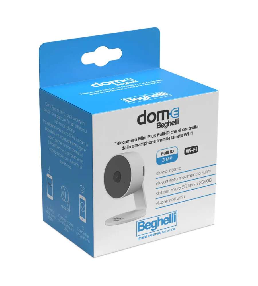 Descrizione: Scopri la Dom-e Videocamera Mini Plus FullHD Beghelli, compatta e controllabile dallo smartphone. Con visione notturna, sensori di movimento e audio a 2 vie, è perfetta per la tua casa smart!
