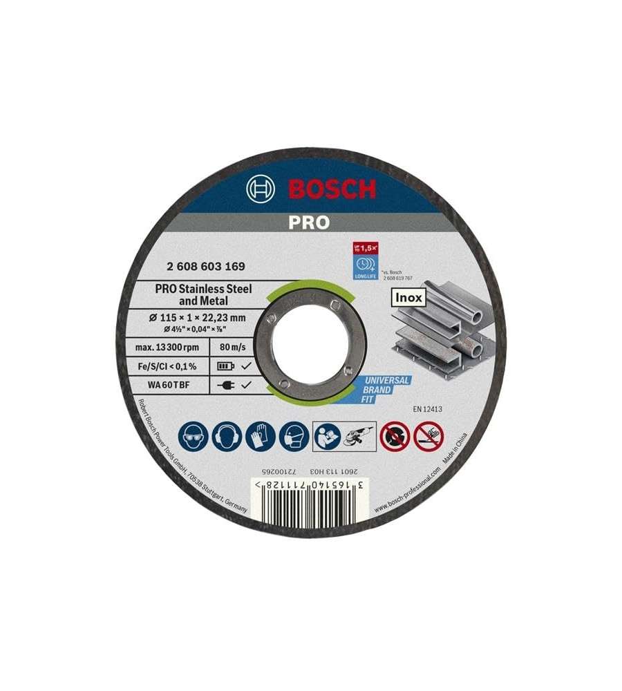Descrizione: Set di 10 mole da taglio Bosch, Ø 115 mm, ideali per acciaio inox. Alta durata e prestazioni eccellenti, compatibili con smerigliatrici angolari. Perfette per lavori di precisione e finitura.
