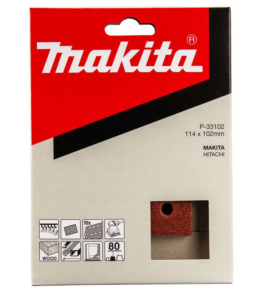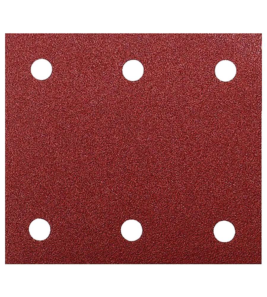 Carta vetrata perforata 114x102 mm, grana K80, confezione da 10 pezzi. Fissaggio con velcro, 6 fori per aspirazione. Ideale per metalli non ferrosi, plastica, legno e pietra. Compatibile con modelli Makita BO4555, BO4556, BO4557.Garanzia: