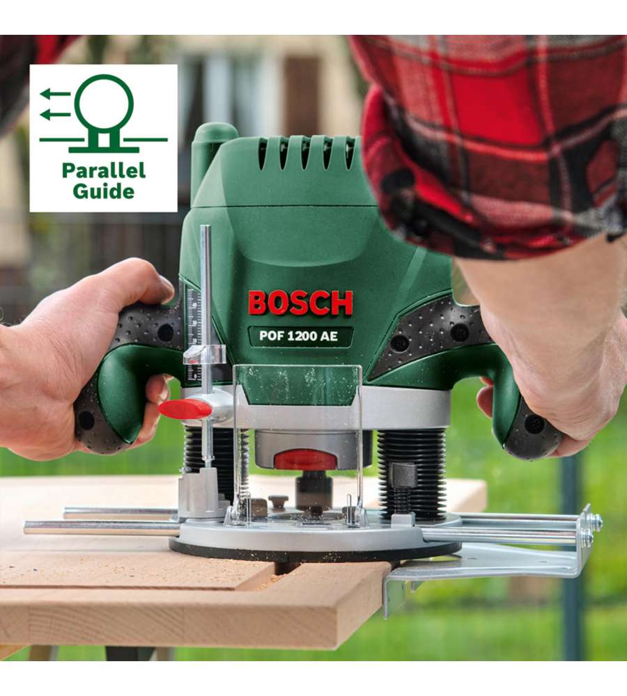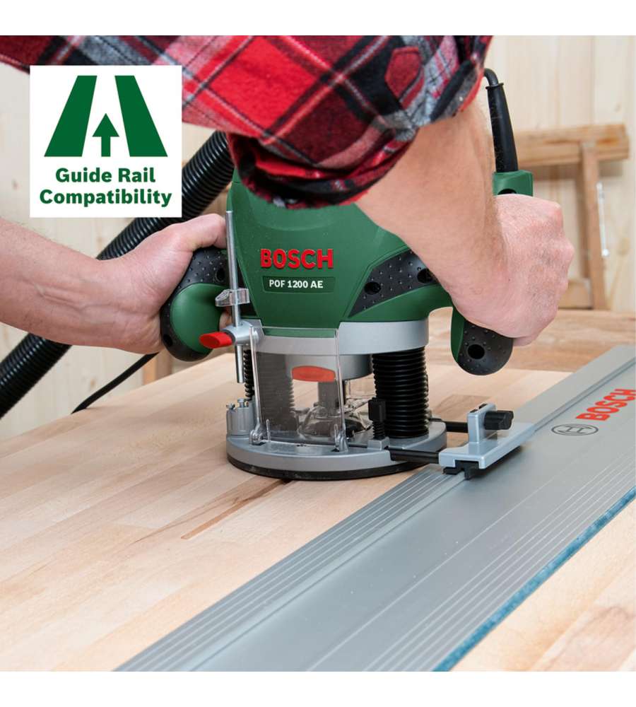 Descrizione: Fresatrice POF1200AE Bosch, potente e versatile, con motore da 1200W e velocità variabile fino a 28.000 giri/min. Include accessori per fresature precise e attacco per aspirazione polveri.