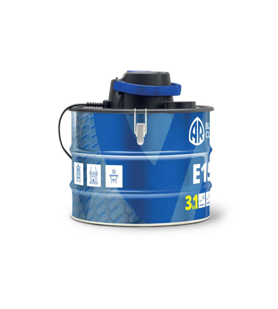 Aspiracenere AR BLUE CLEAN 15lt mod. E15: ideale per ceneri fredde da stufe, camini e barbecue. Dotato di filtro Hepa con protezione in rete metallica e funzione soffiaggio. Fusto in acciaio, maniglia integrata, tubo flessibile in metallo.