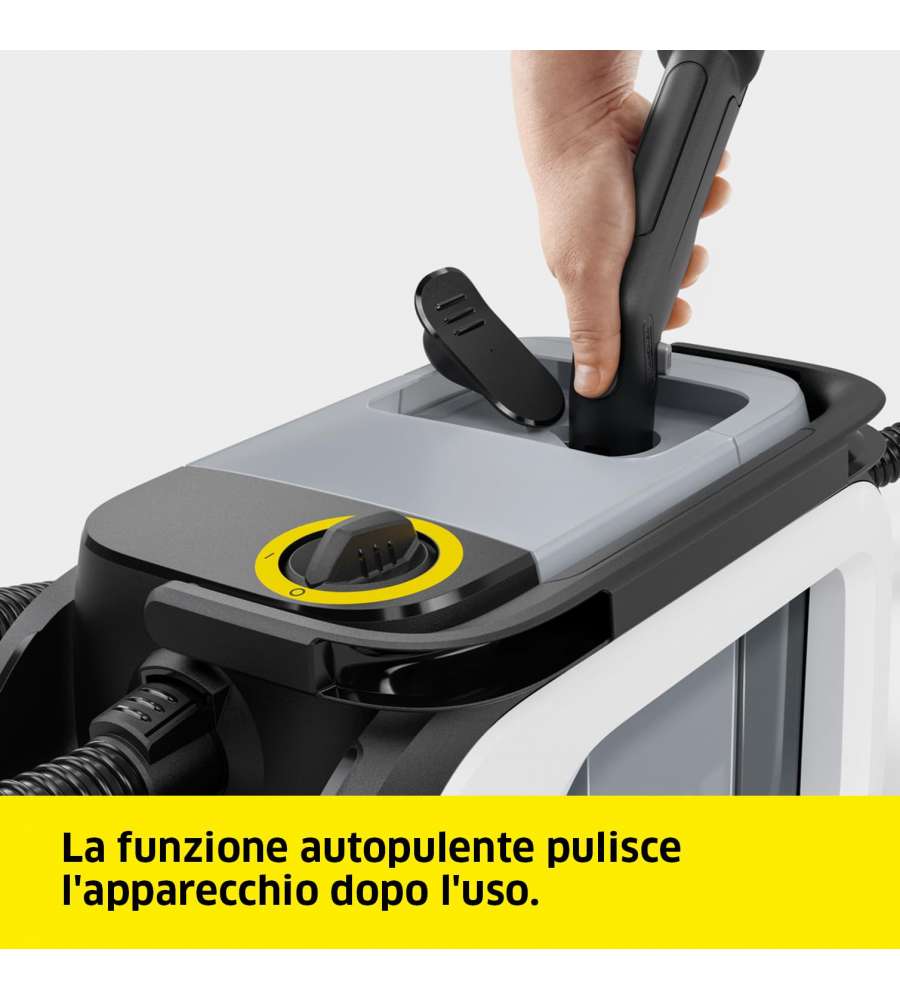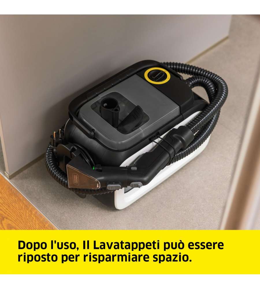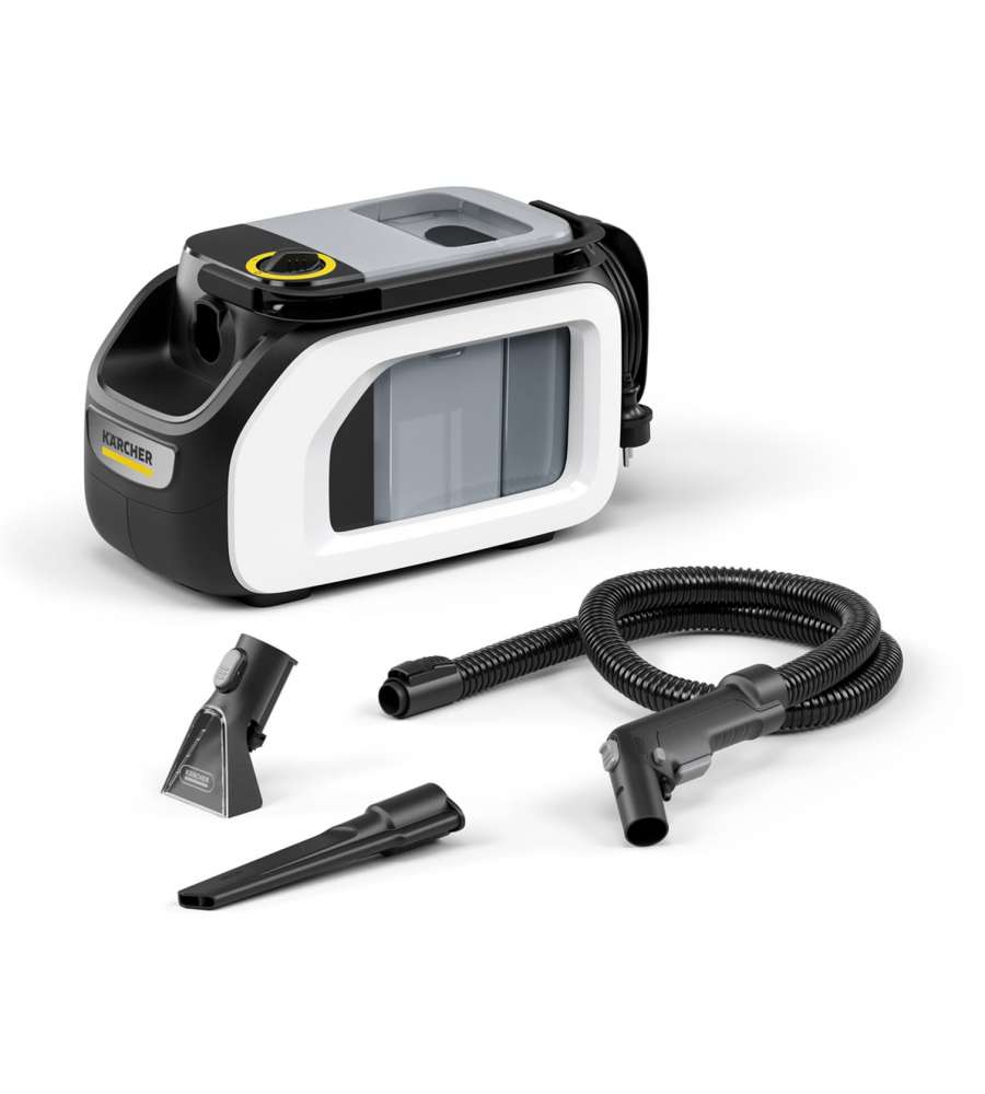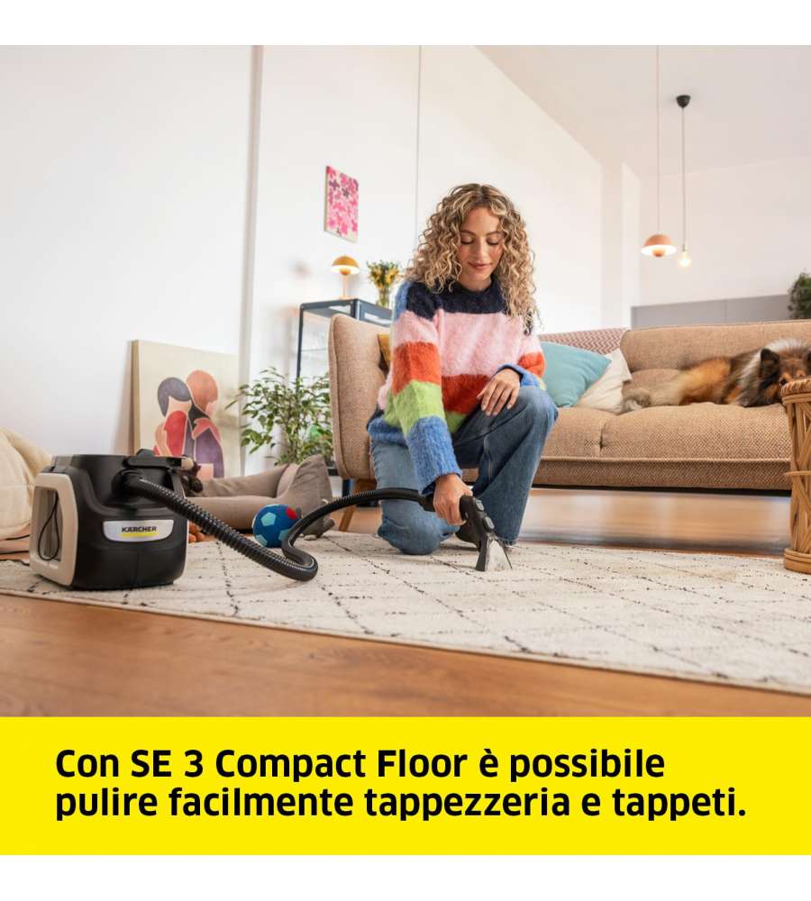 Descrizione: Lavatappeti e smacchiatore Kärcher SE 3 Compact, potente e portatile, per una pulizia profonda di tappeti e imbottiti. Tubo flessibile integrato e funzioni di autopulizia per risultati ottimali. Raggio operativo di 5,8 m.