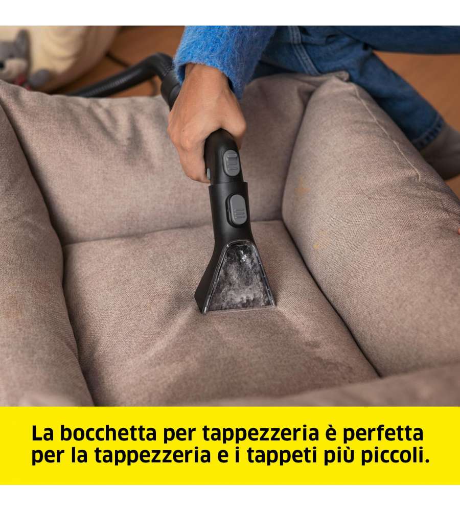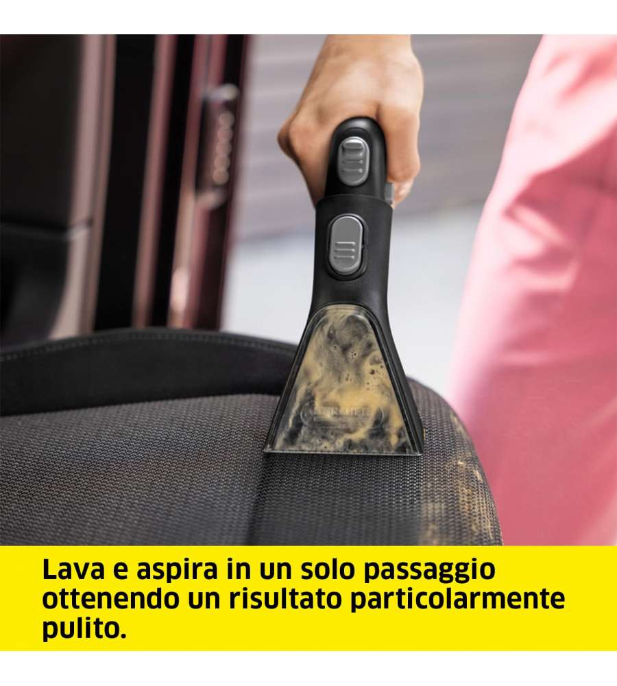 Pulizia profonda per tappeti e tessuti, con serbatoio da 1,7 litri e peso di 5 kg. Include tubo a spruzzo integrato e bocchette per tappezzeria e fessure. Funzione autopulente e design portatile. Potenza 500W, colore bianco.